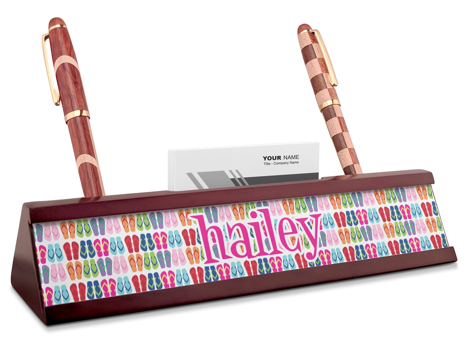 Your desk name plates are crafted from a high-quality, dark-cherry mahogany. At approximately 9.5 by 1.875 by 2.5 inches, this name plaque will fit perfectly, front and center, on your desk. Your customization spans across the entire face of the nameplate. Behind the nameplate lies a skinny slot that can fit approximately 15, traditionally-sized, business cards. You can also store your writing utensils on either side of this custom desk name plate.