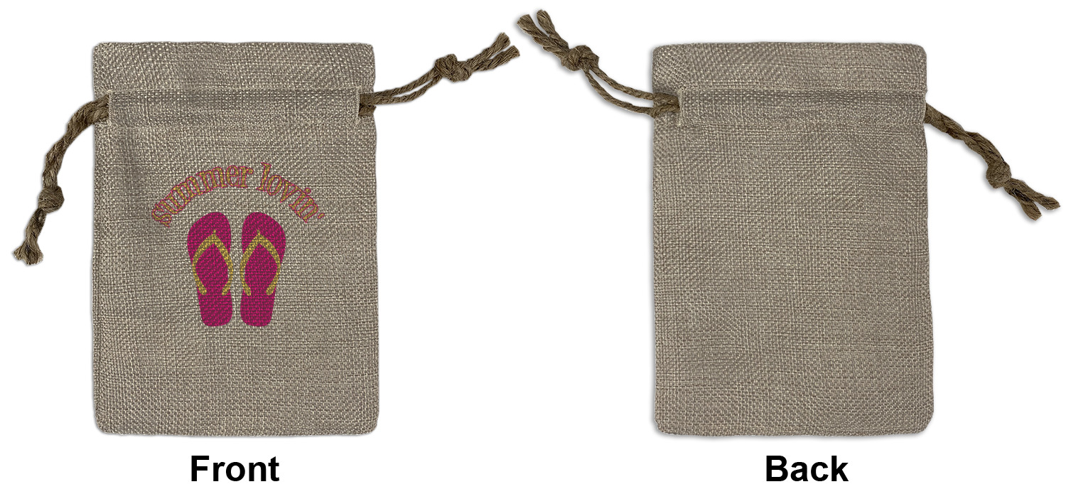 We sell our Burlap Gift Bags in 3 variant sized bags. Made with burlap polyester, each personalized bag can be secured with a twine drawstring pull. Your custom design is available to print on one side or both sides - completely up to you! The sizes of the bags measure approximately 4.5" x 6.5" for the smallest size, 6.5" x 8.0" for the medium size, and 6.5" x 13.5" for the large-sized bag.