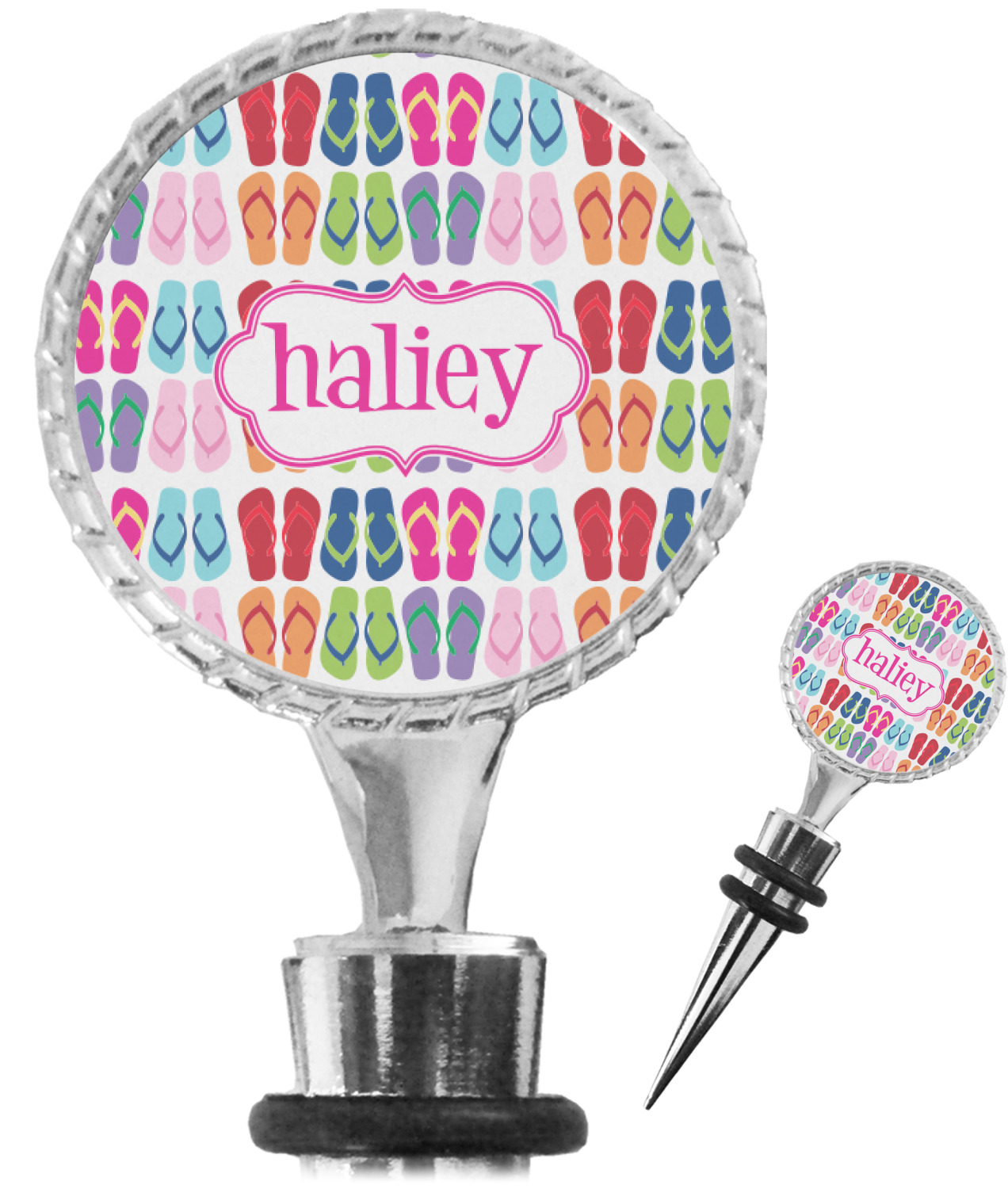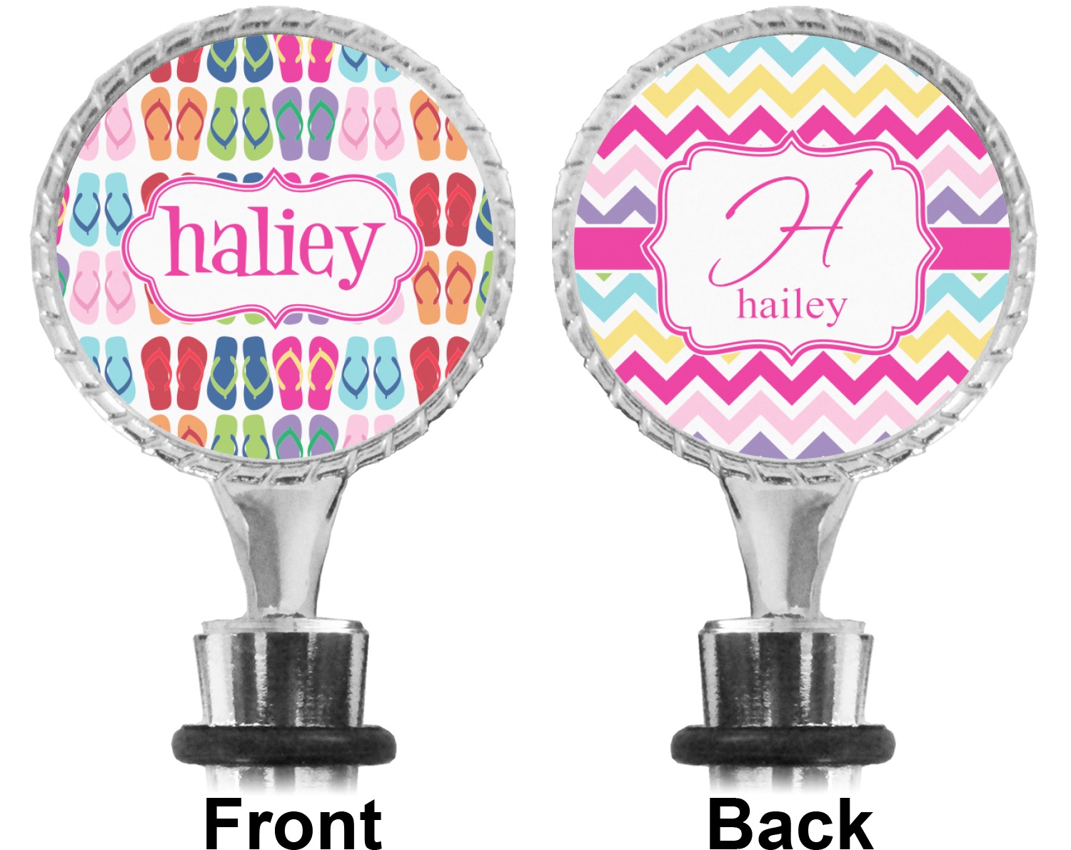 The top part of your bottle stopper is comprised of a zinc ring that displays your customization(s) in its middle, on both sides. The ring is heavy duty, with a bright chrome finish. The body of the wine stoppers have two silicone rings to provide an airtight seal. These wine bottle stoppers measure at 1.625" L x 0.8125" W x 4.625" H; your custom wine stopper is meant to fit into most standard-sized wine bottles.