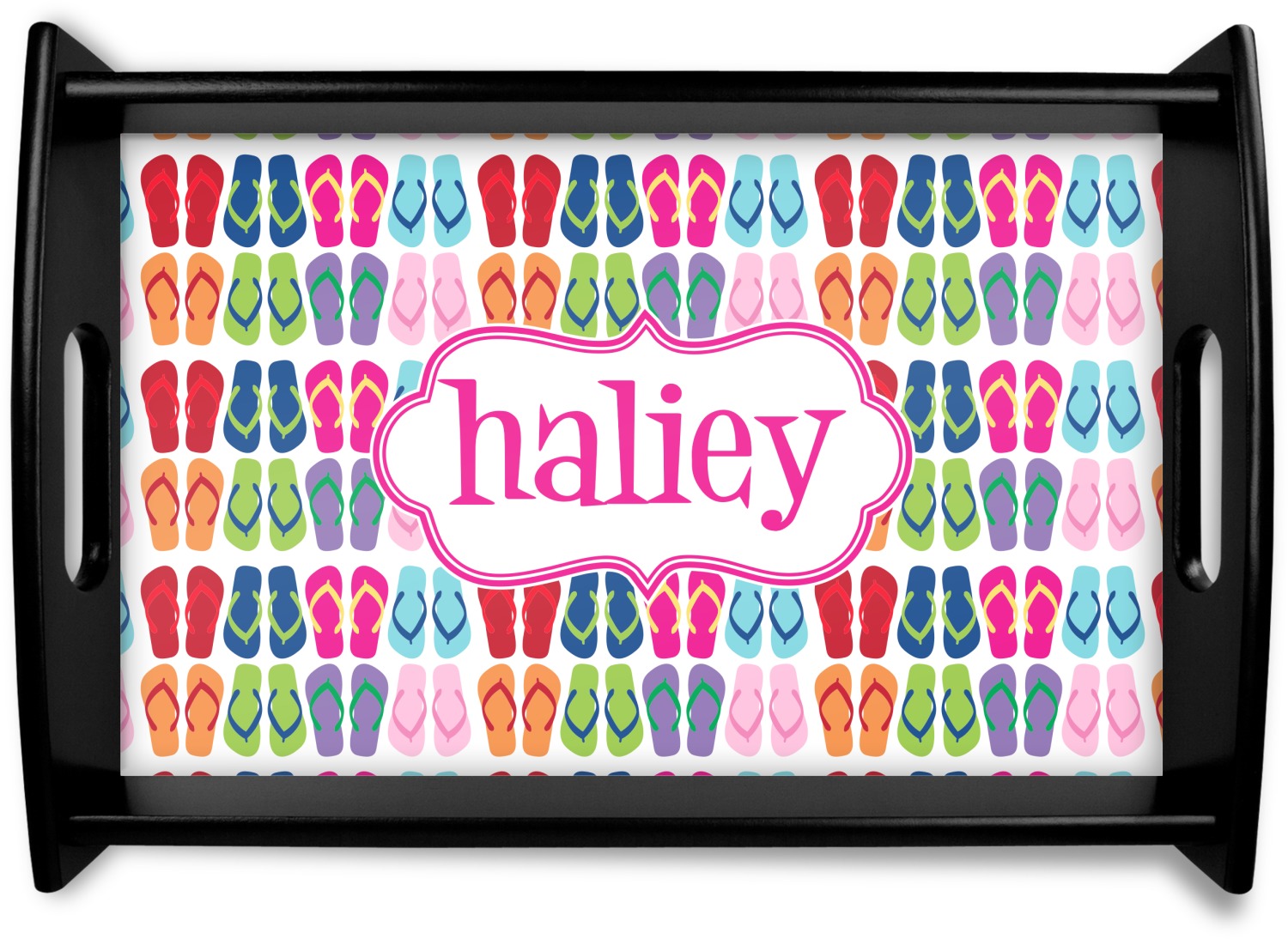 This serving tray with handles features square edges and two rounded sides, creating a very modern look. Each side is fabricated from a beautifully cut, natural wood. The bottom of the interior of the tray displays your customized design in bright, vibrant color. The tray is sold in both a black color and a natural wood look. Each variation of the wood serving tray has two sizes: Small, which is 14" x 10" x 2.25", and Large, which is 19.5" x 13.5" x 2.75".