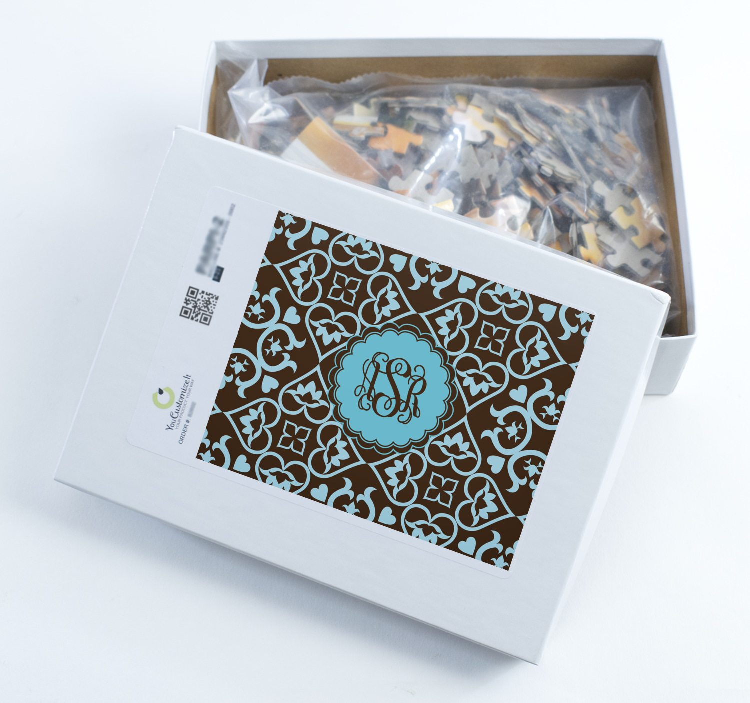 Depending on the look you are trying to achieve, you can add; a thematic pattern or background, with a photo in a frame and text or personalization to your puzzle. Basically if you can imagine it, you can design it!