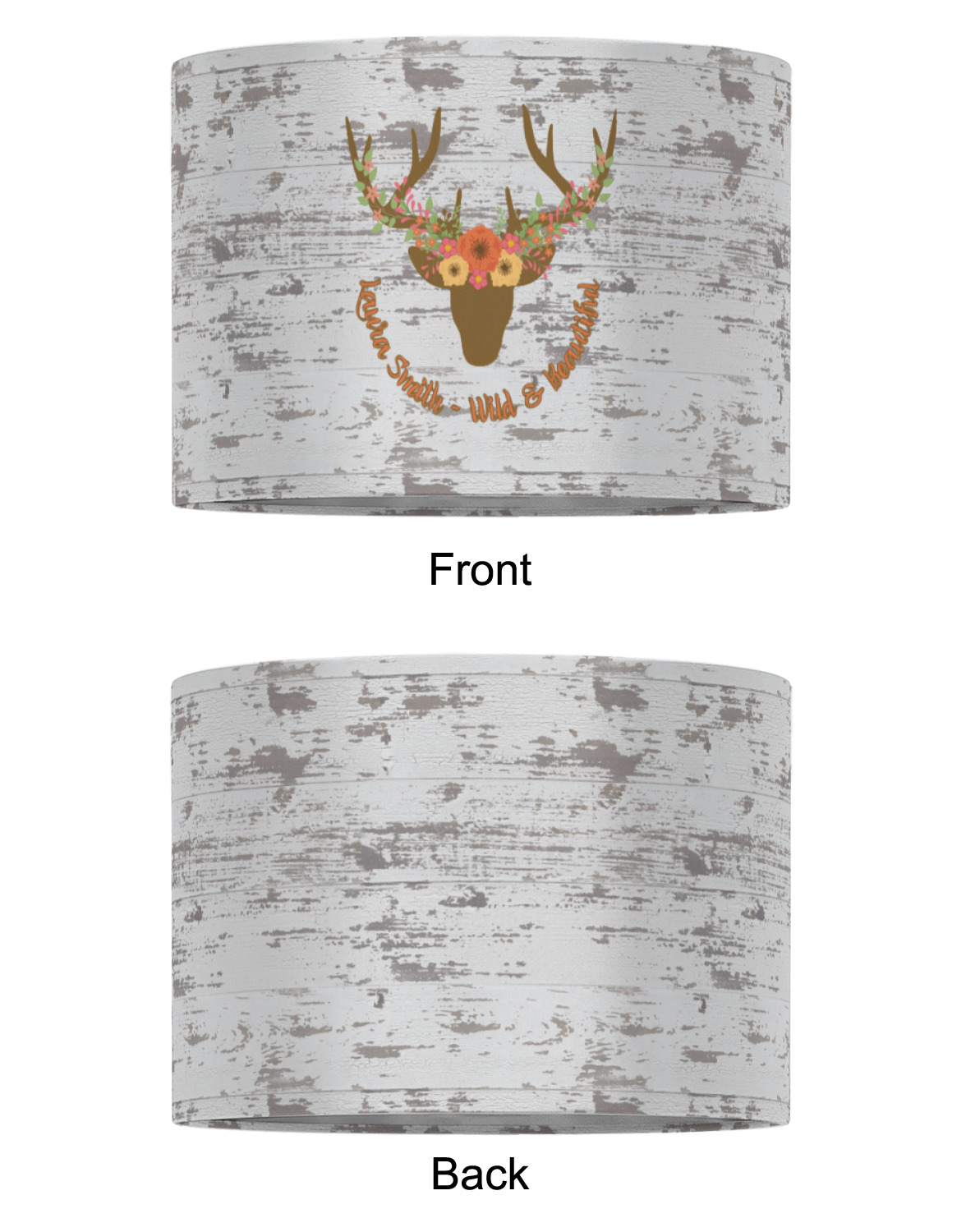 This design has a fun distressed shiplap background that is tones of white and grey. On top of this is an adorable deer illustration with flowers surrounding its antlers. Underneath is a curving area for personalization. Add your name or a fun saying. You will find brown, pink, peach, yellow, and green in this fun design.