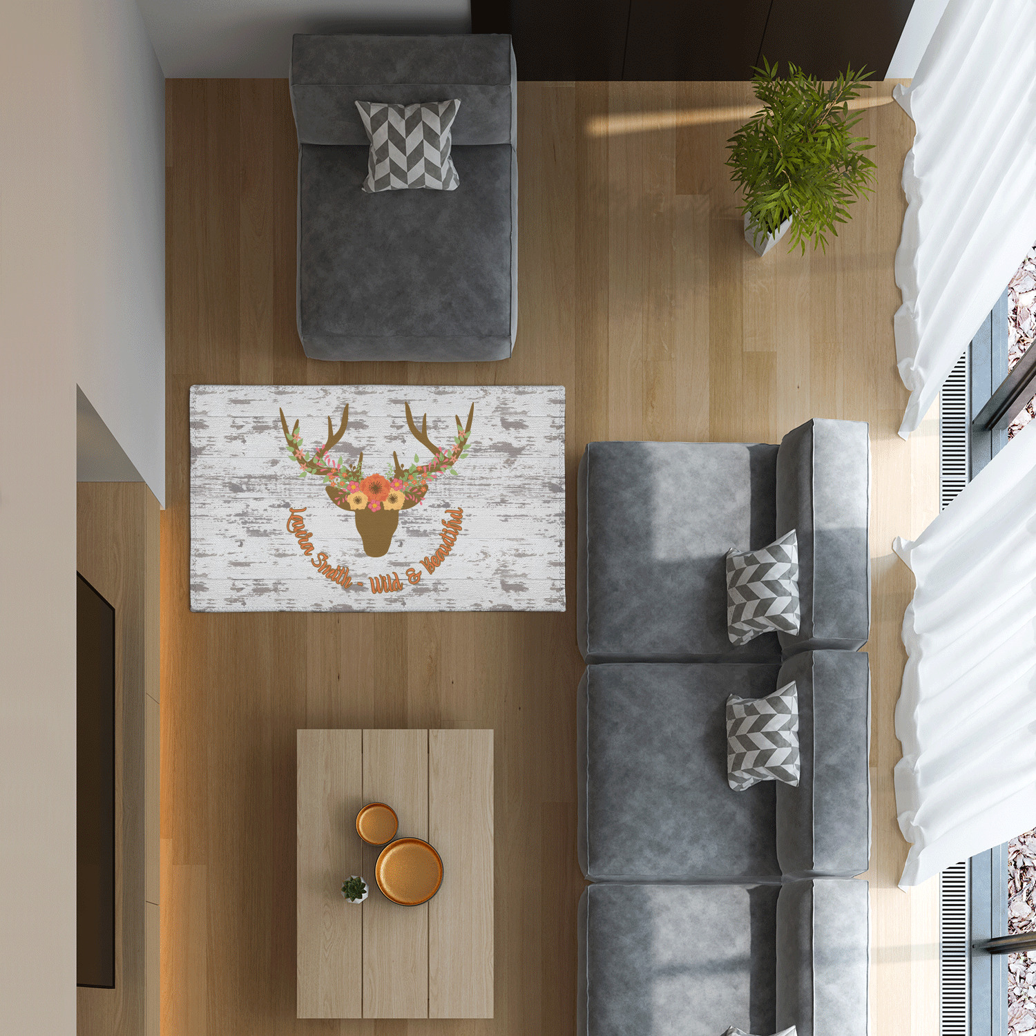 This design has a fun distressed shiplap background that is tones of white and grey. On top of this is an adorable deer illustration with flowers surrounding its antlers. Underneath is a curving area for personalization. Add your name or a fun saying. You will find brown, pink, peach, yellow, and green in this fun design.