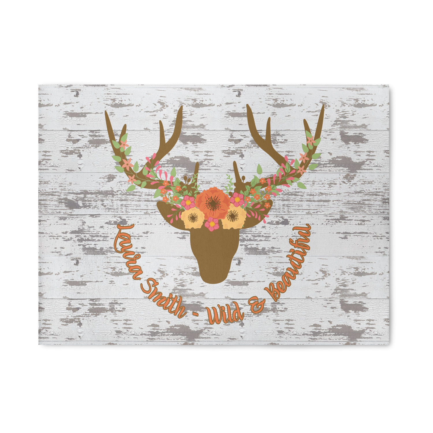 This design has a fun distressed shiplap background that is tones of white and grey. On top of this is an adorable deer illustration with flowers surrounding its antlers. Underneath is a curving area for personalization. Add your name or a fun saying. You will find brown, pink, peach, yellow, and green in this fun design.