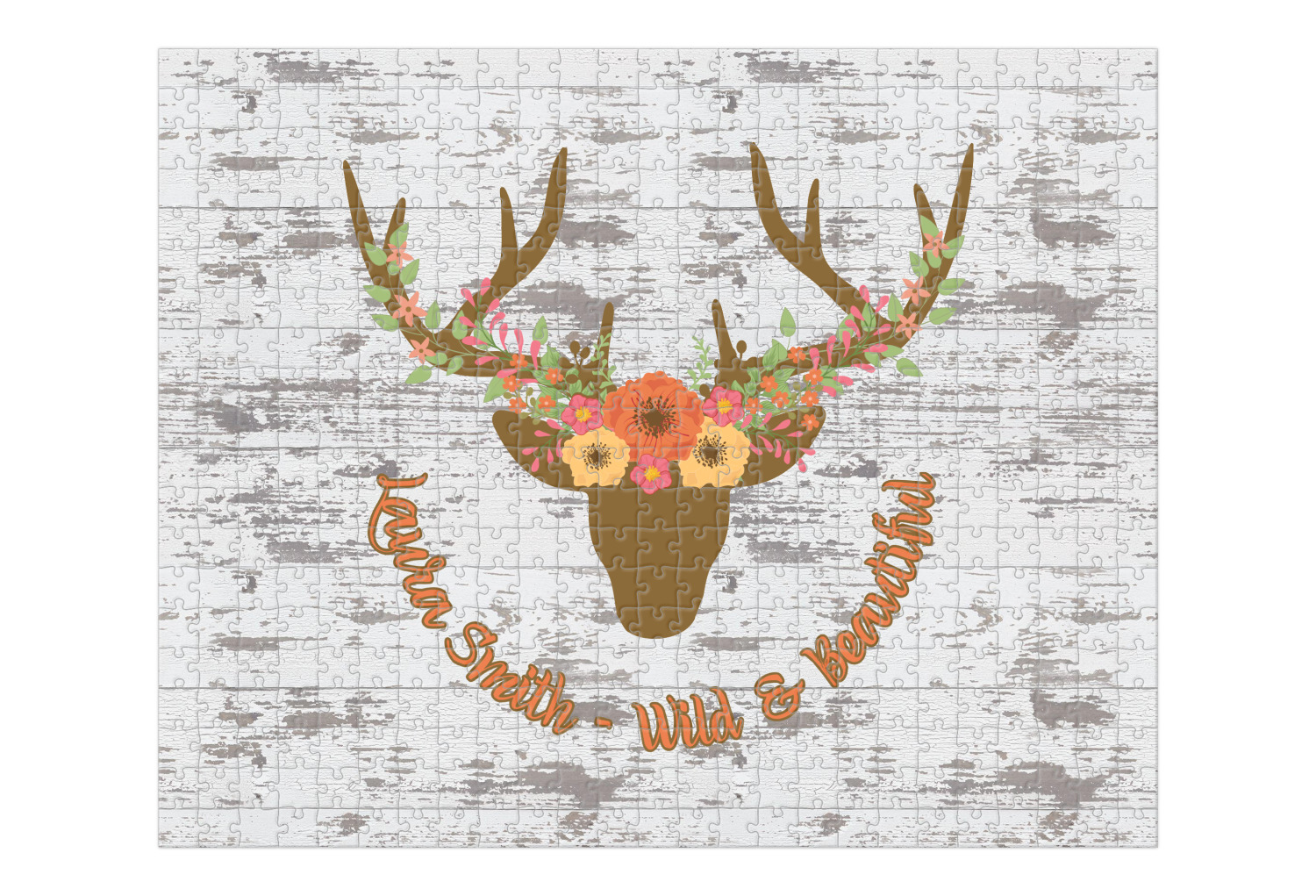 This design has a fun distressed shiplap background that is tones of white and grey. On top of this is an adorable deer illustration with flowers surrounding its antlers. Underneath is a curving area for personalization. Add your name or a fun saying. You will find brown, pink, peach, yellow, and green in this fun design.