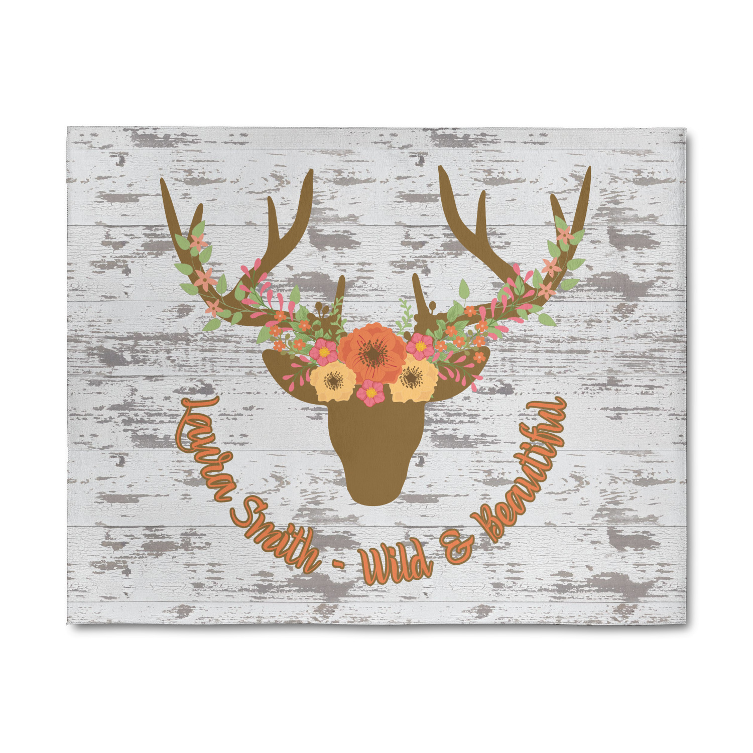 This design has a fun distressed shiplap background that is tones of white and grey. On top of this is an adorable deer illustration with flowers surrounding its antlers. Underneath is a curving area for personalization. Add your name or a fun saying. You will find brown, pink, peach, yellow, and green in this fun design.