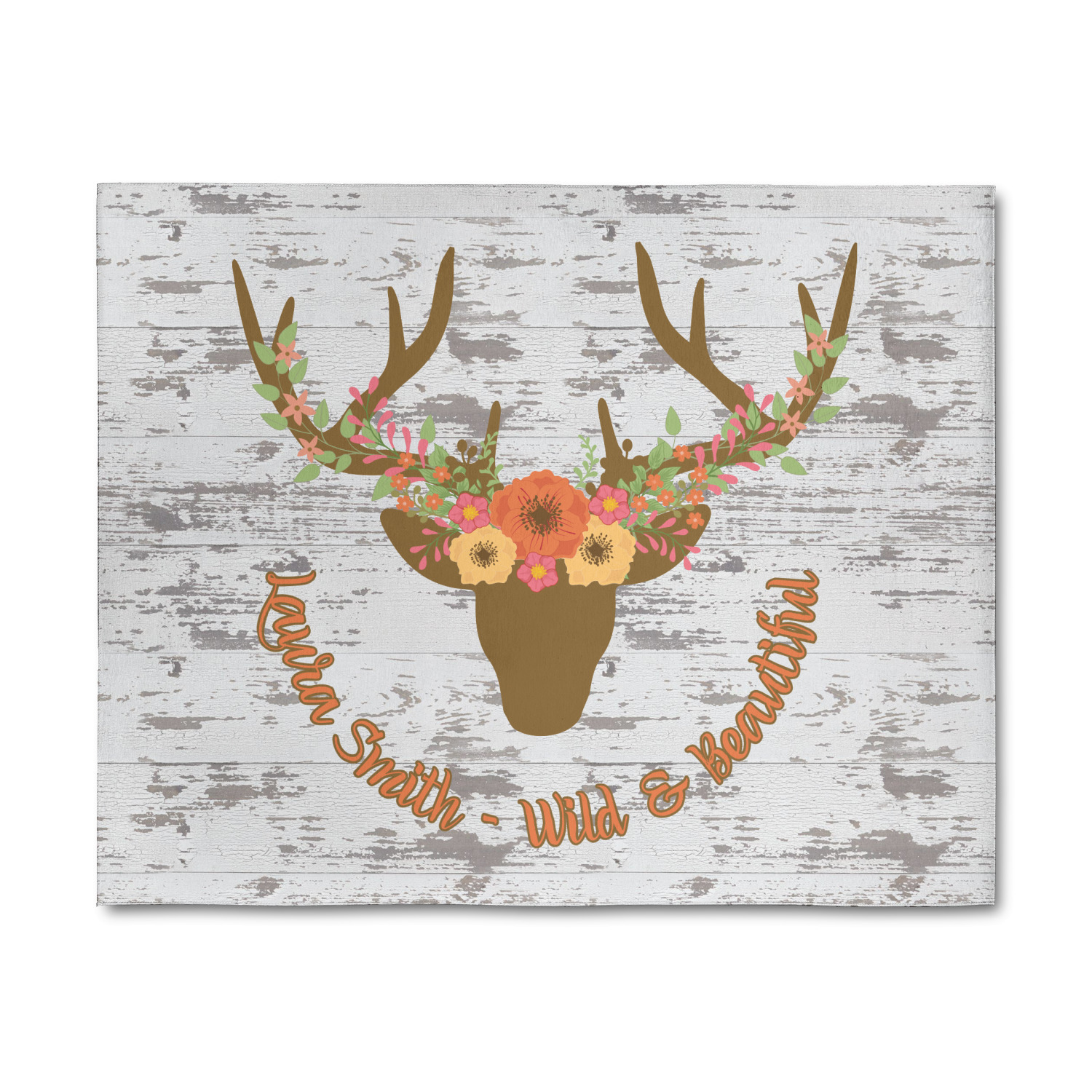 This design has a fun distressed shiplap background that is tones of white and grey. On top of this is an adorable deer illustration with flowers surrounding its antlers. Underneath is a curving area for personalization. Add your name or a fun saying. You will find brown, pink, peach, yellow, and green in this fun design.