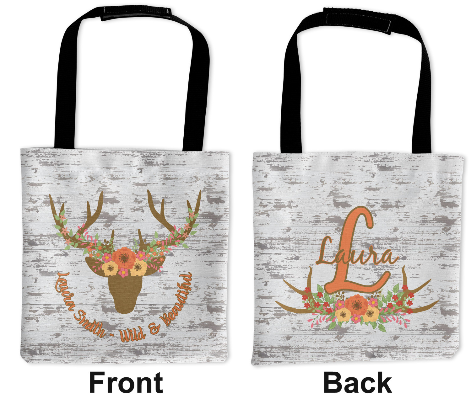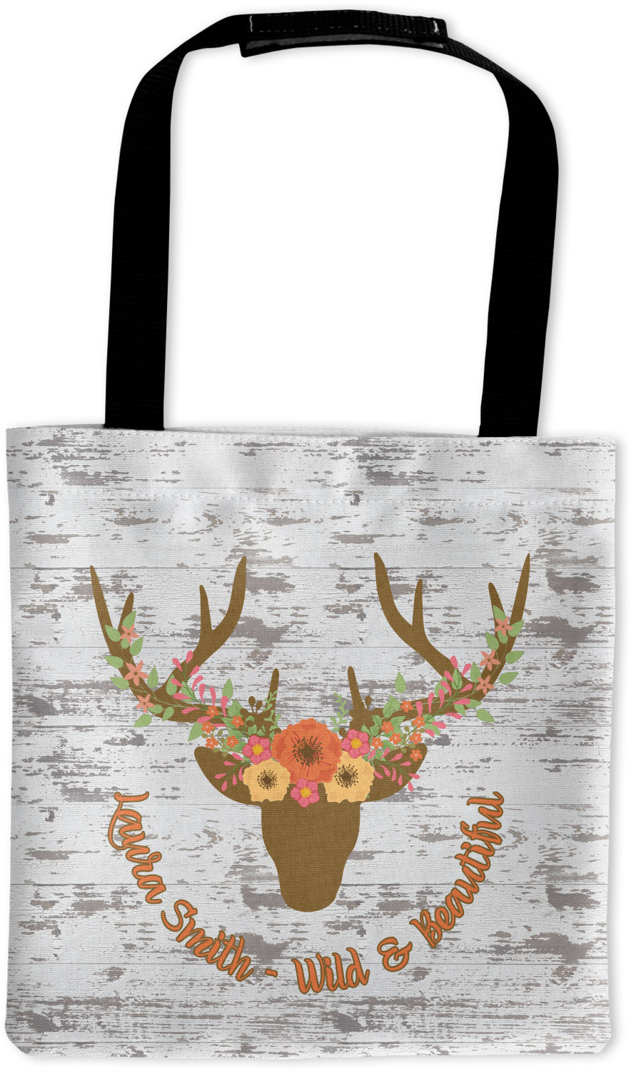 This design has a fun distressed shiplap background that is tones of white and grey. On top of this is an adorable deer illustration with flowers surrounding its antlers. Underneath is a curving area for personalization. Add your name or a fun saying. You will find brown, pink, peach, yellow, and green in this fun design.