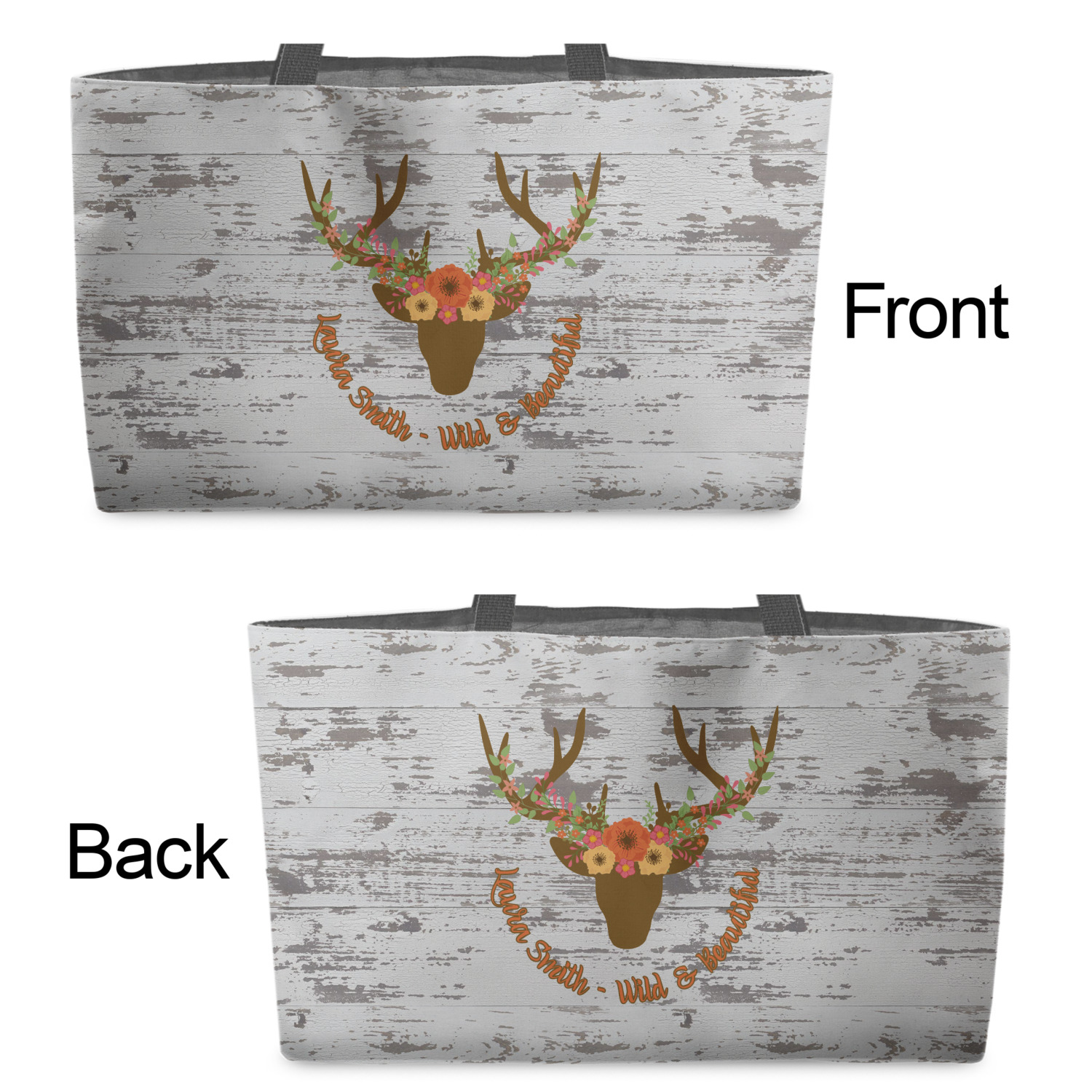 You can design the totes with a design on the front and another one on the back. The two designs can be identical or completely different. The choice is yours.