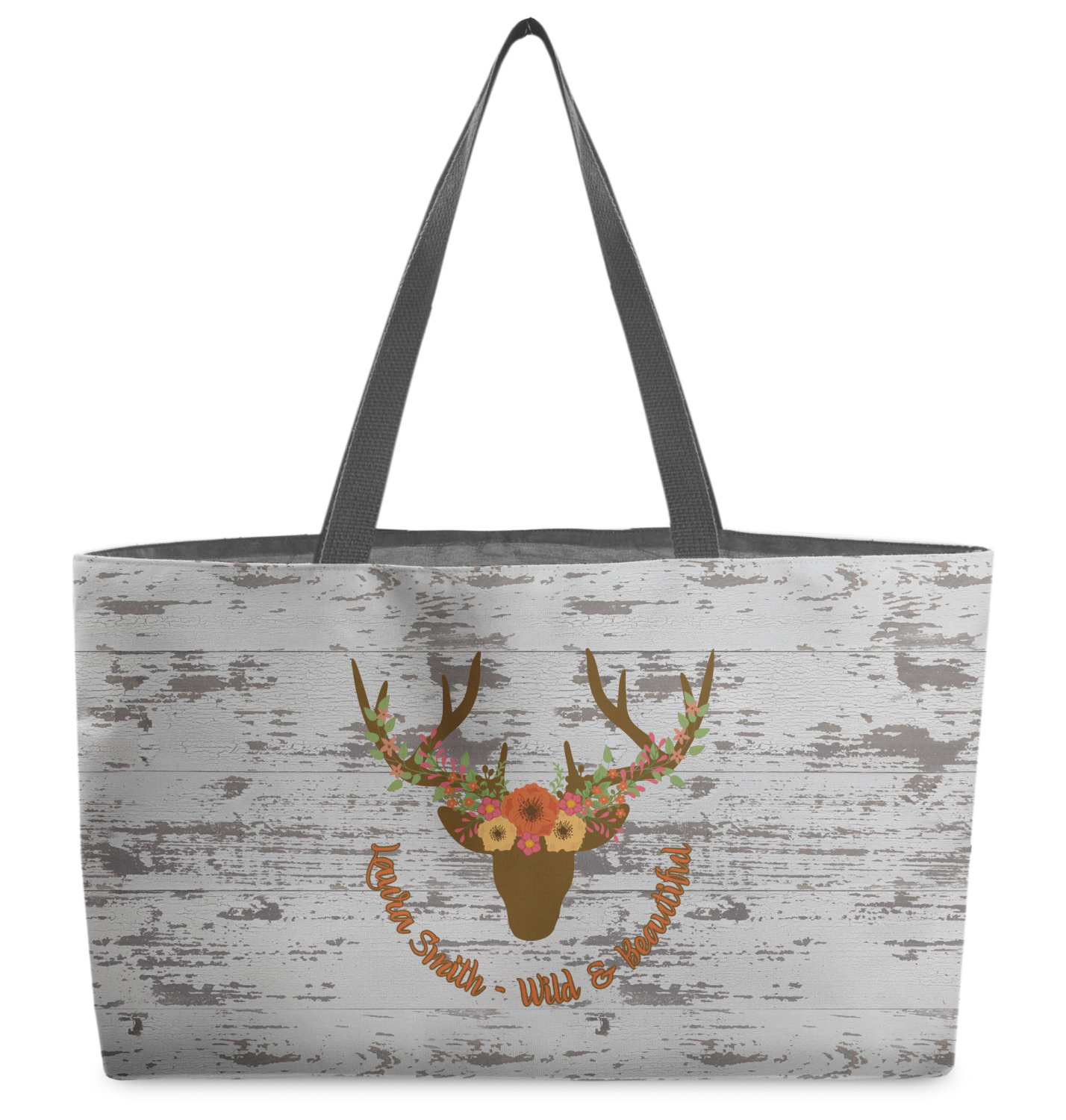 This design has a fun distressed shiplap background that is tones of white and grey. On top of this is an adorable deer illustration with flowers surrounding its antlers. Underneath is a curving area for personalization. Add your name or a fun saying. You will find brown, pink, peach, yellow, and green in this fun design.