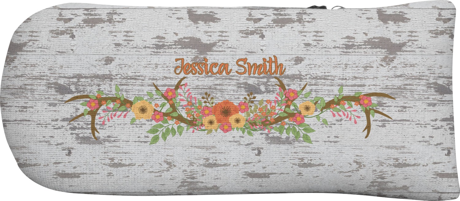 This design has a fun distressed shiplap background that is tones of white and grey. On top of this is an adorable deer illustration with flowers surrounding its antlers. Underneath is a curving area for personalization. Add your name or a fun saying. You will find brown, pink, peach, yellow, and green in this fun design.