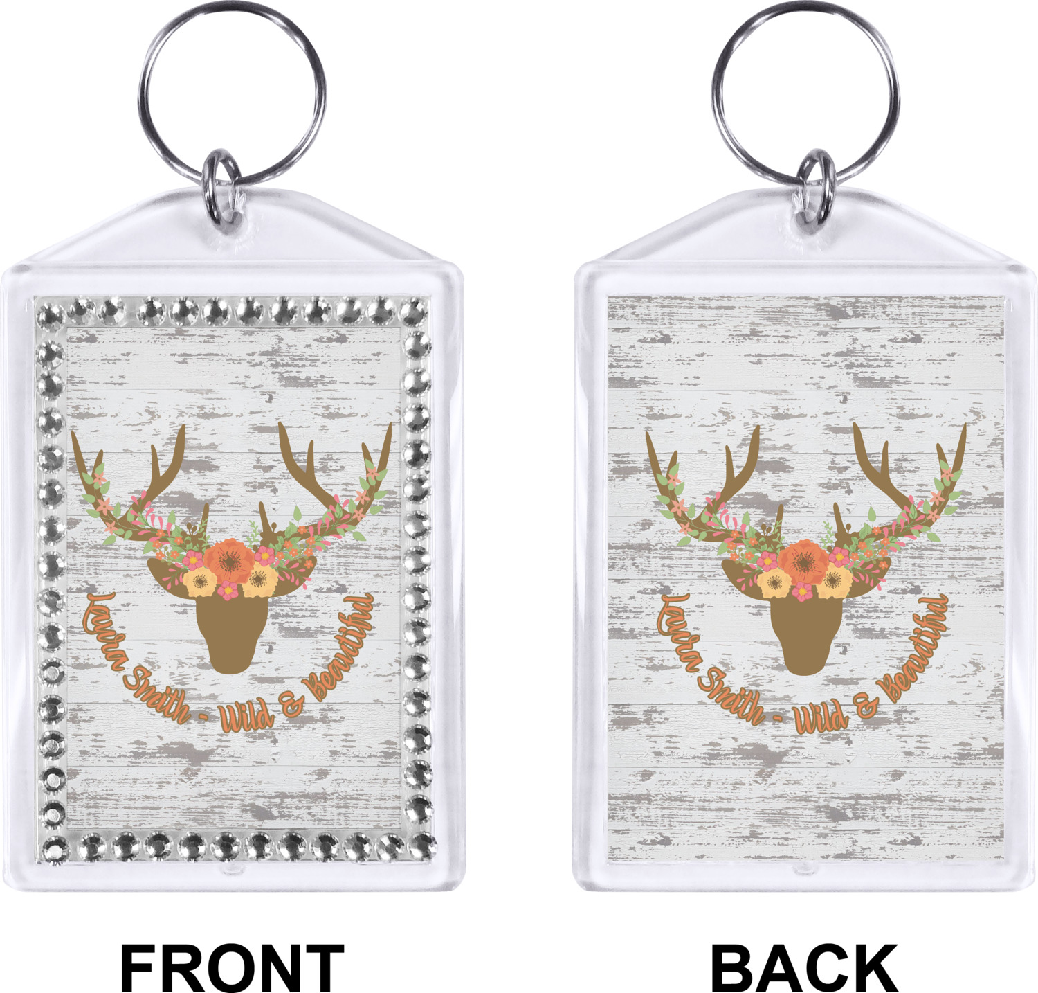 Our personalized keychains have a bold, rectangular shape, outlined by a series of shimmering rhinestones. A metal, split keyring is included with your purchase, and an additional metal hoop allows for attachment of the keychain to the split ring. This unique keychain measures at about 3.75 by 2.5 inches. We print your customized design(s) across both the back and front of this keychain.