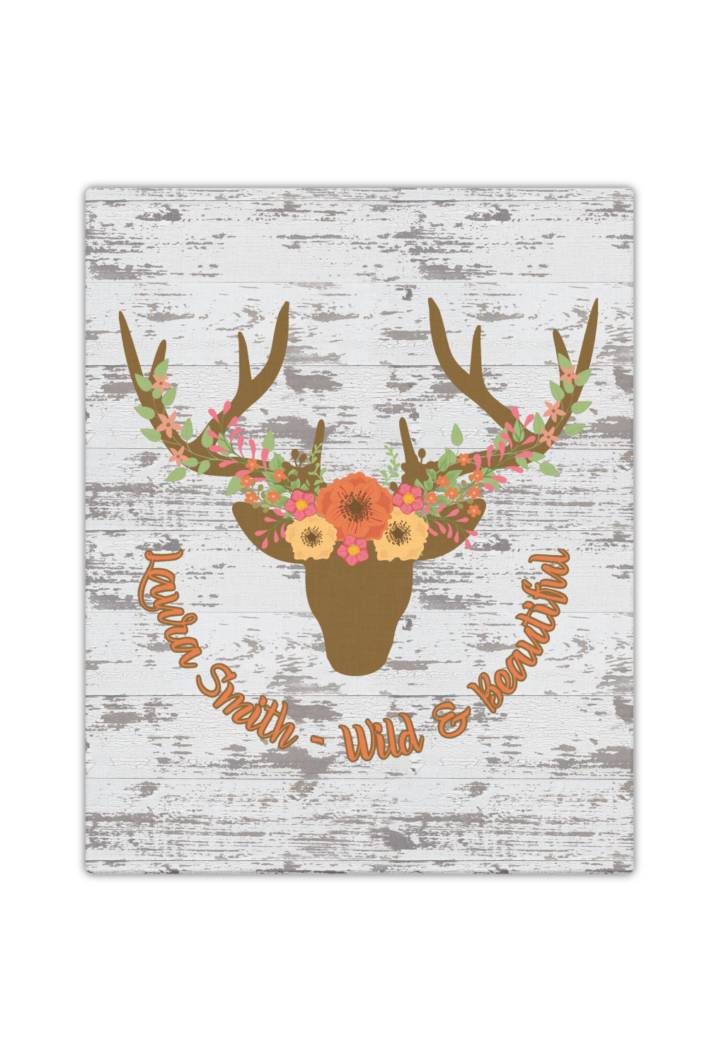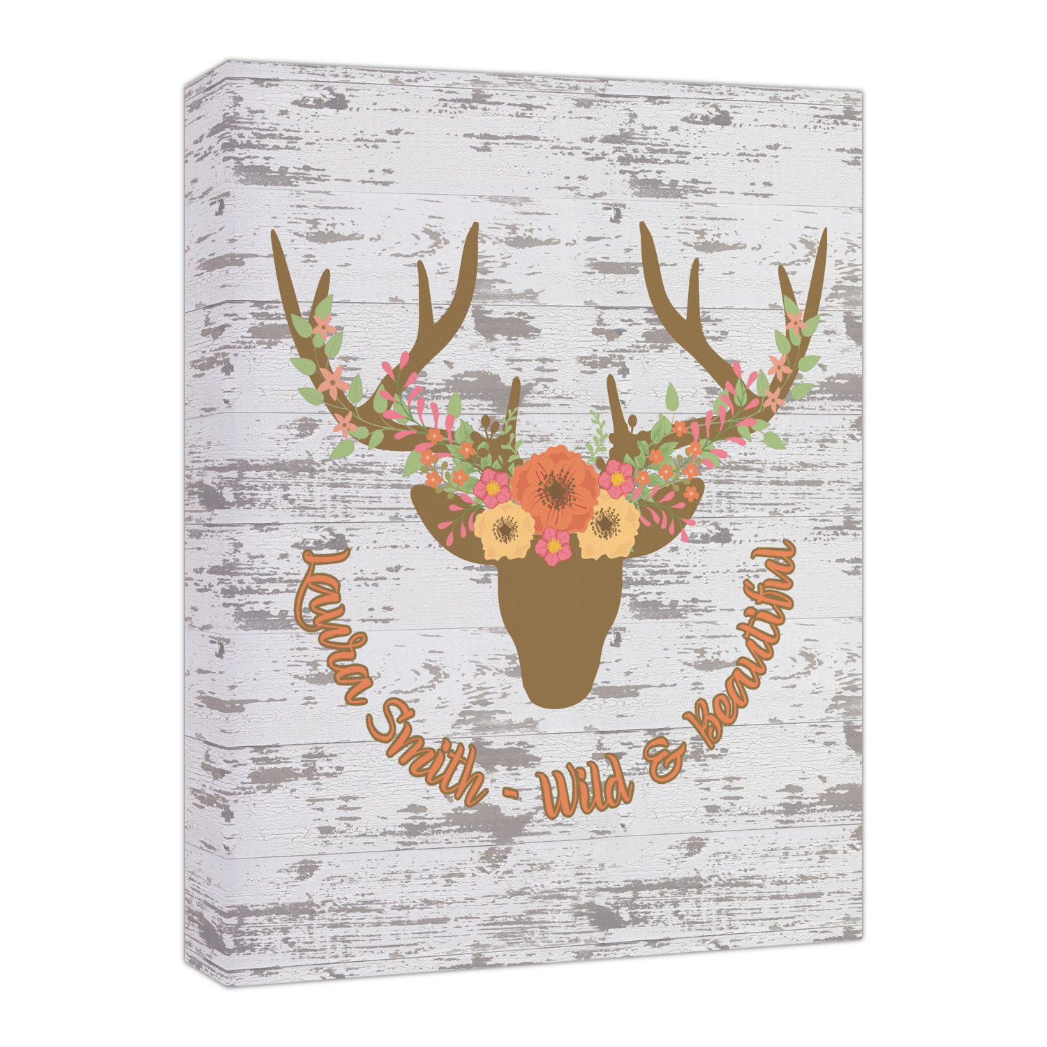 This design has a fun distressed shiplap background that is tones of white and grey. On top of this is an adorable deer illustration with flowers surrounding its antlers. Underneath is a curving area for personalization. Add your name or a fun saying. You will find brown, pink, peach, yellow, and green in this fun design.