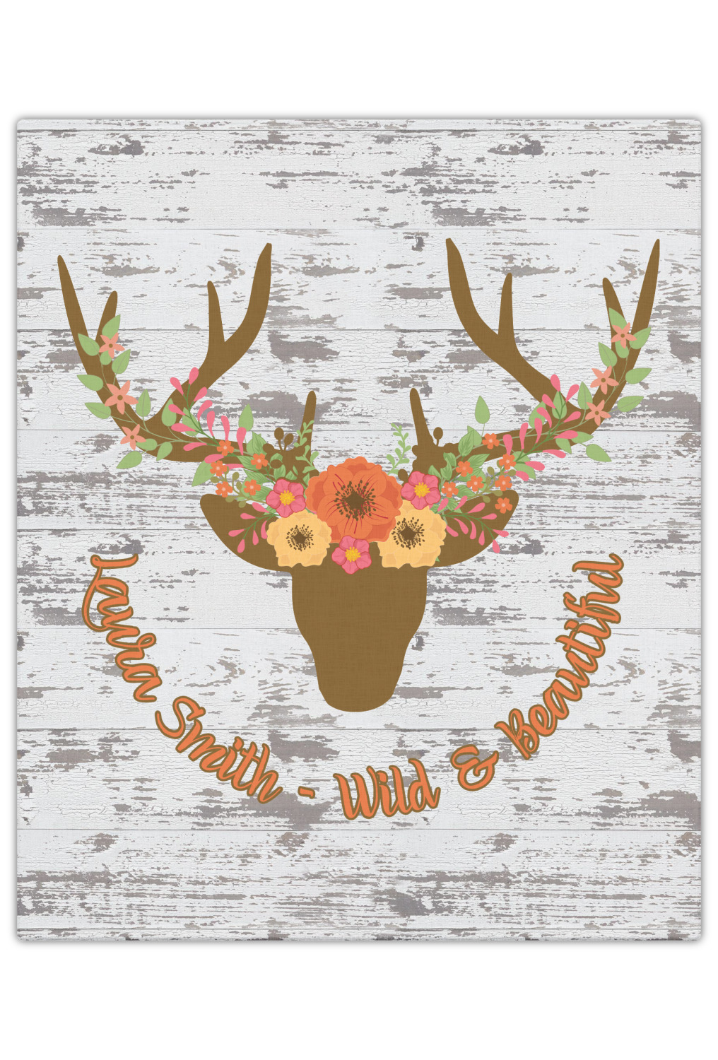This design has a fun distressed shiplap background that is tones of white and grey. On top of this is an adorable deer illustration with flowers surrounding its antlers. Underneath is a curving area for personalization. Add your name or a fun saying. You will find brown, pink, peach, yellow, and green in this fun design.