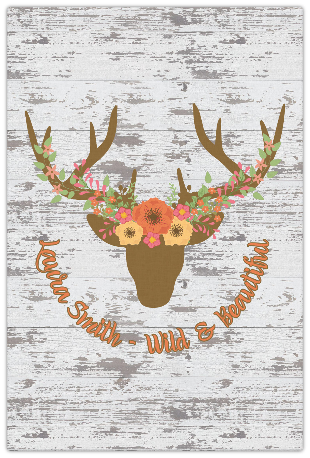 This design has a fun distressed shiplap background that is tones of white and grey. On top of this is an adorable deer illustration with flowers surrounding its antlers. Underneath is a curving area for personalization. Add your name or a fun saying. You will find brown, pink, peach, yellow, and green in this fun design.