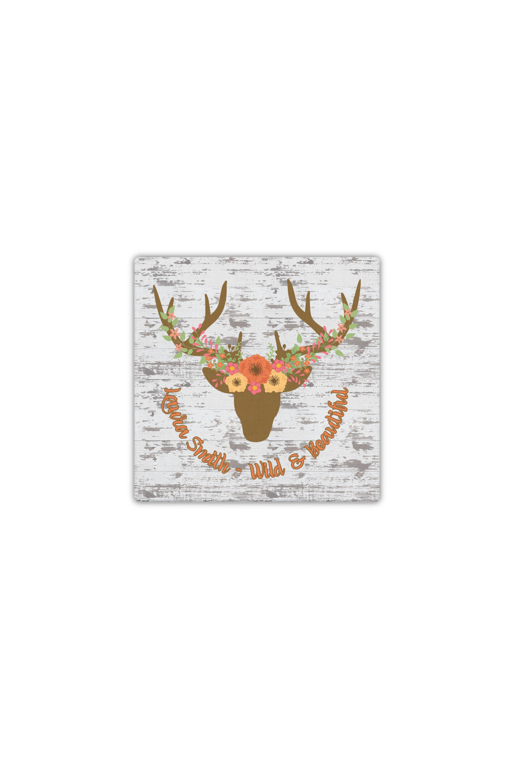 This design has a fun distressed shiplap background that is tones of white and grey. On top of this is an adorable deer illustration with flowers surrounding its antlers. Underneath is a curving area for personalization. Add your name or a fun saying. You will find brown, pink, peach, yellow, and green in this fun design.