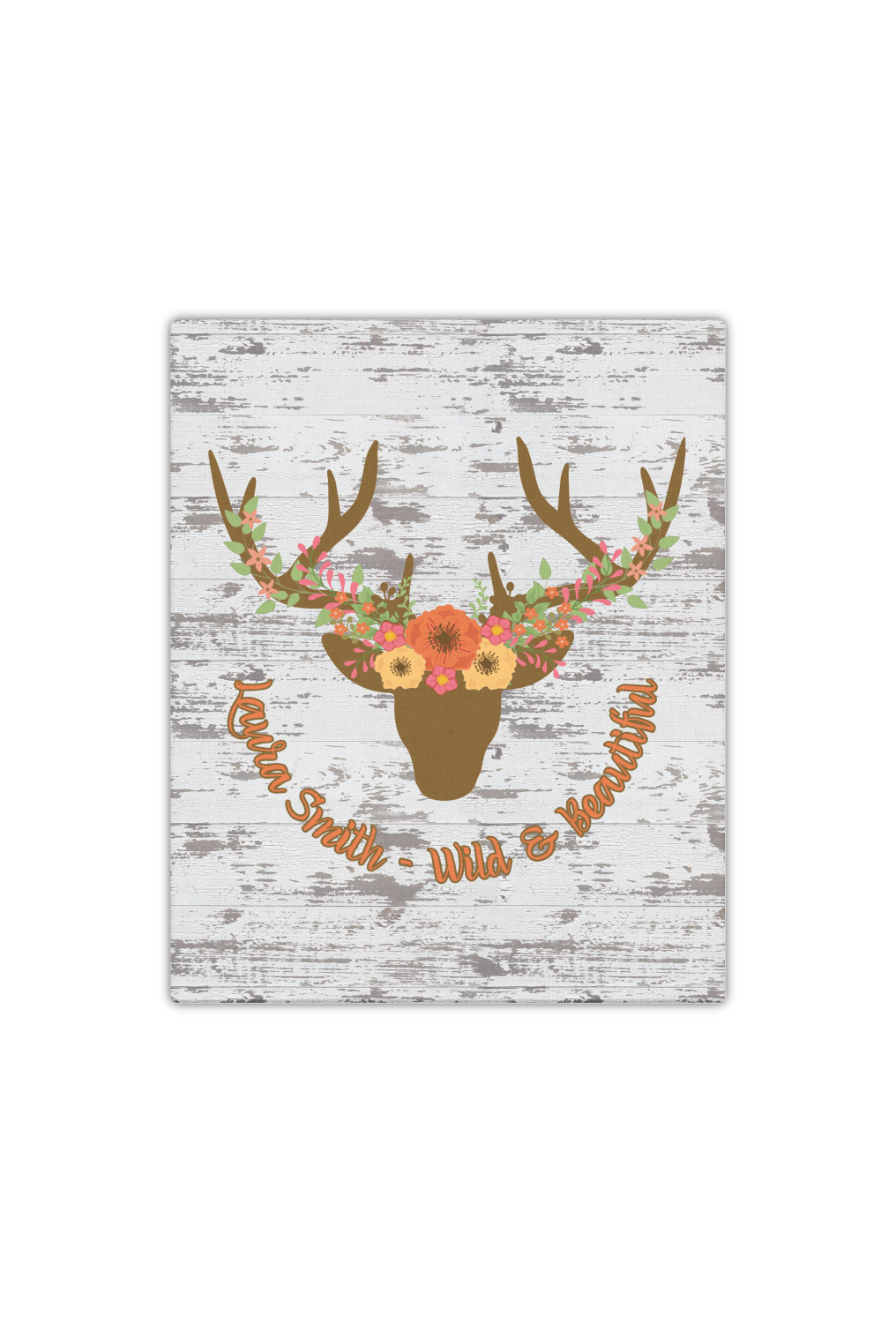 This design has a fun distressed shiplap background that is tones of white and grey. On top of this is an adorable deer illustration with flowers surrounding its antlers. Underneath is a curving area for personalization. Add your name or a fun saying. You will find brown, pink, peach, yellow, and green in this fun design.