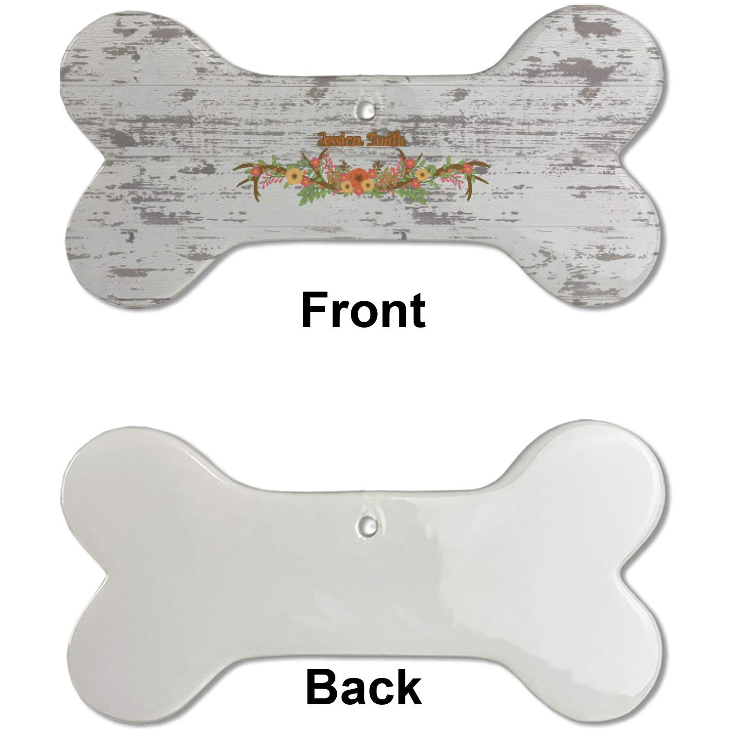 Our dog Christmas ornaments are a ceramic material with a bone-shaped structure hung horizontally. We offer two printing styles to personalize your furry friend's ornament! Choose a one-sided printing, perfect for wall decor, memorial accessory, or doghouse nameplate! Create a double-sided ornament perfect for adorning the Christmas tree. Each dog bone ornament is approximately 4.75" x 2.25" and is printed here in the USA.