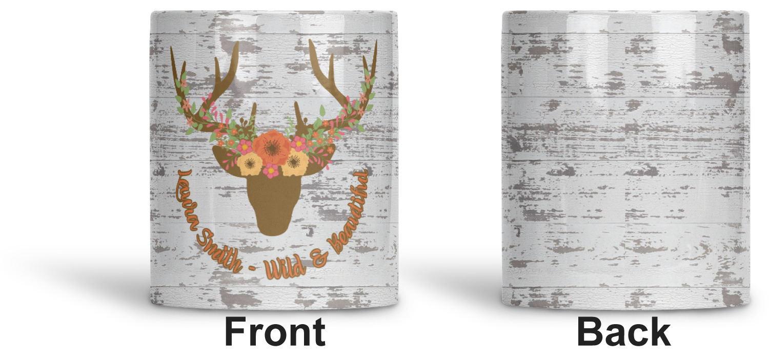 This design has a fun distressed shiplap background that is tones of white and grey. On top of this is an adorable deer illustration with flowers surrounding its antlers. Underneath is a curving area for personalization. Add your name or a fun saying. You will find brown, pink, peach, yellow, and green in this fun design.