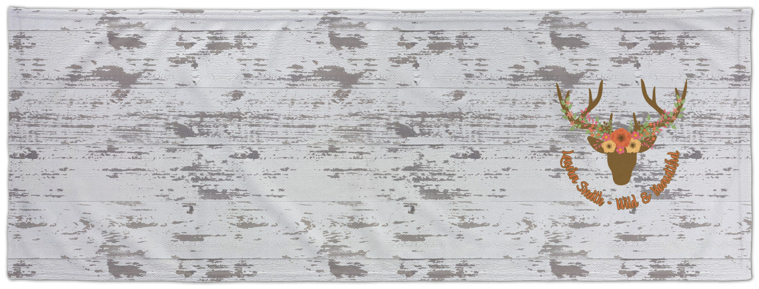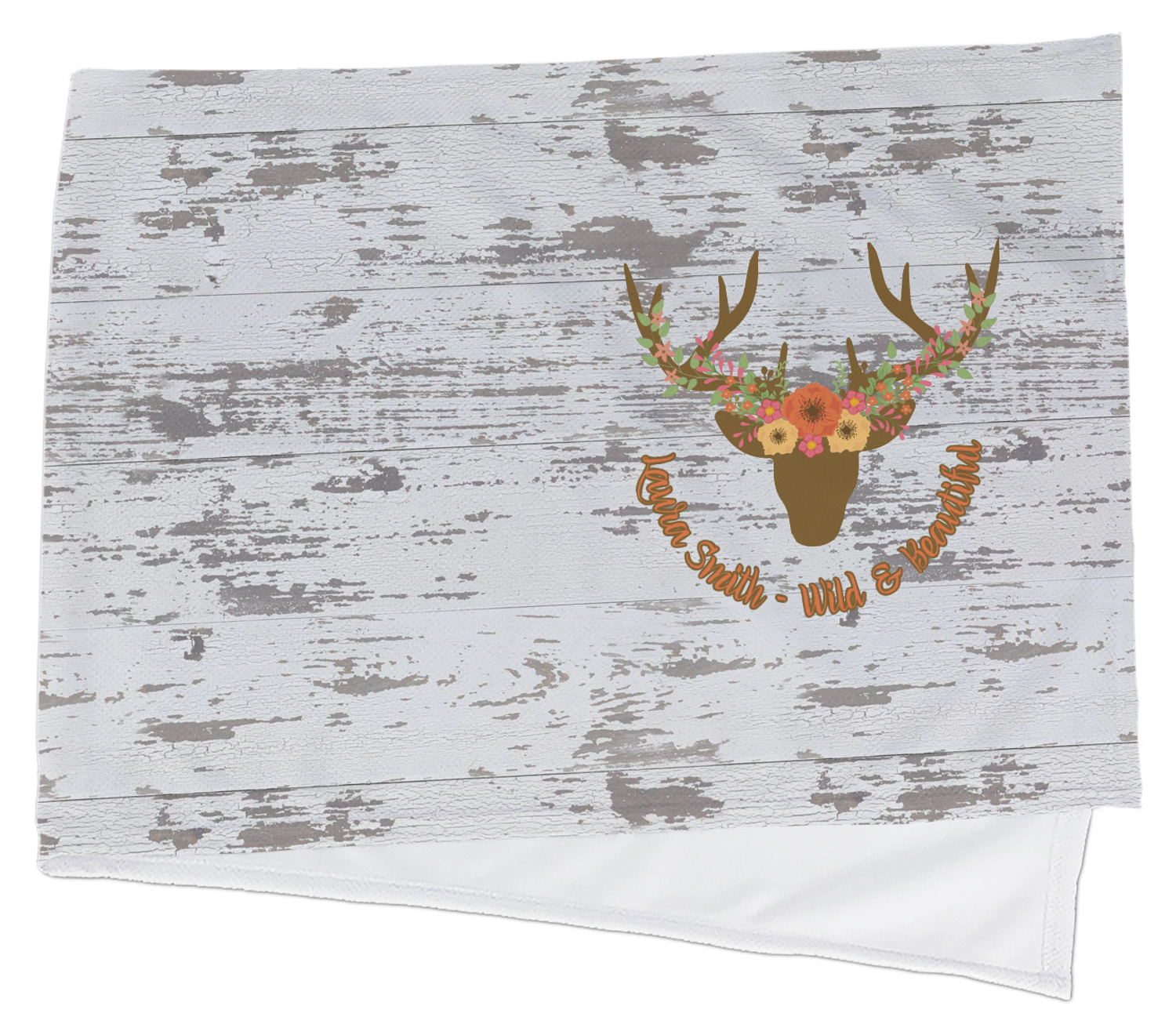 This design has a fun distressed shiplap background that is tones of white and grey. On top of this is an adorable deer illustration with flowers surrounding its antlers. Underneath is a curving area for personalization. Add your name or a fun saying. You will find brown, pink, peach, yellow, and green in this fun design.
