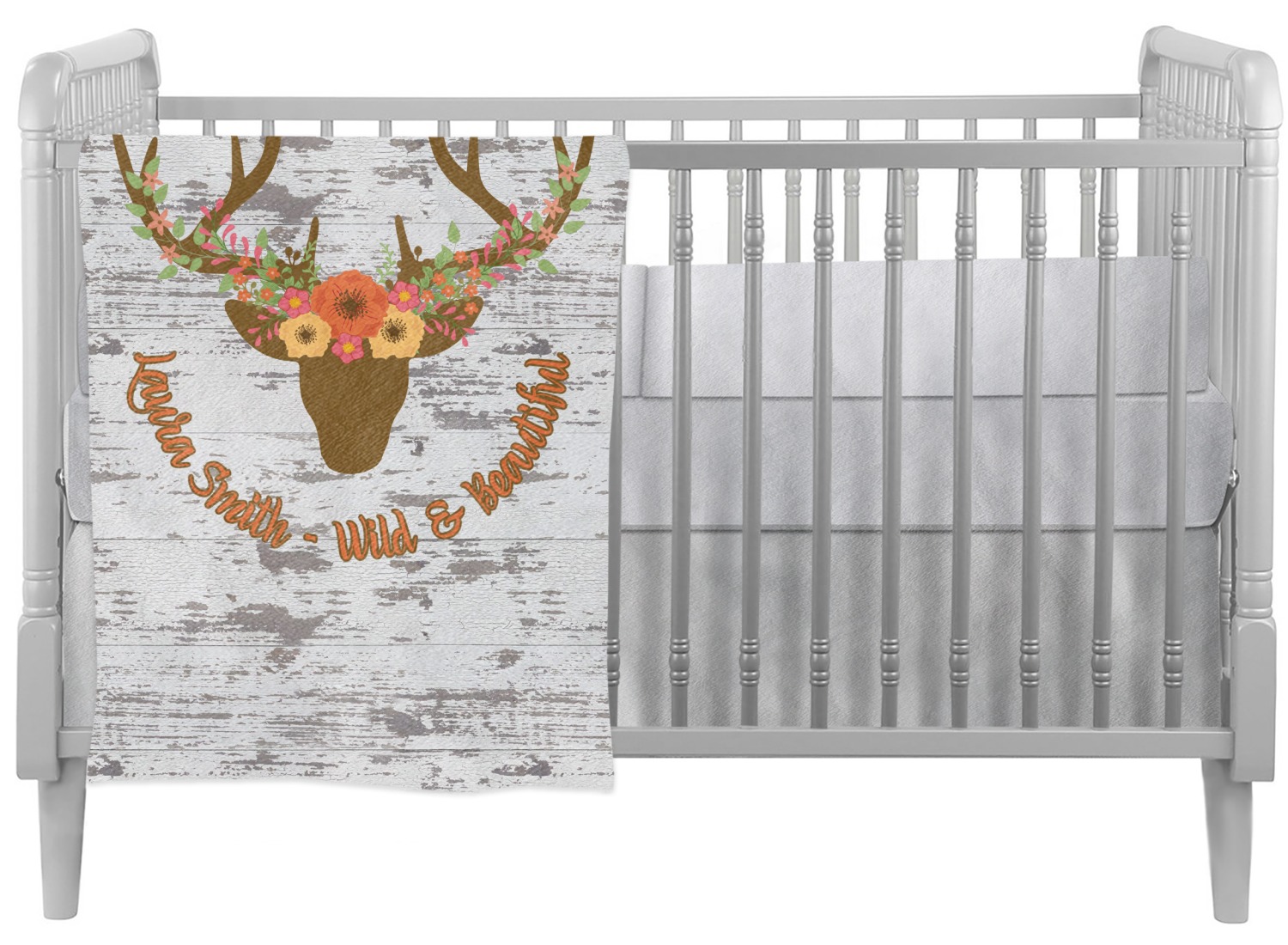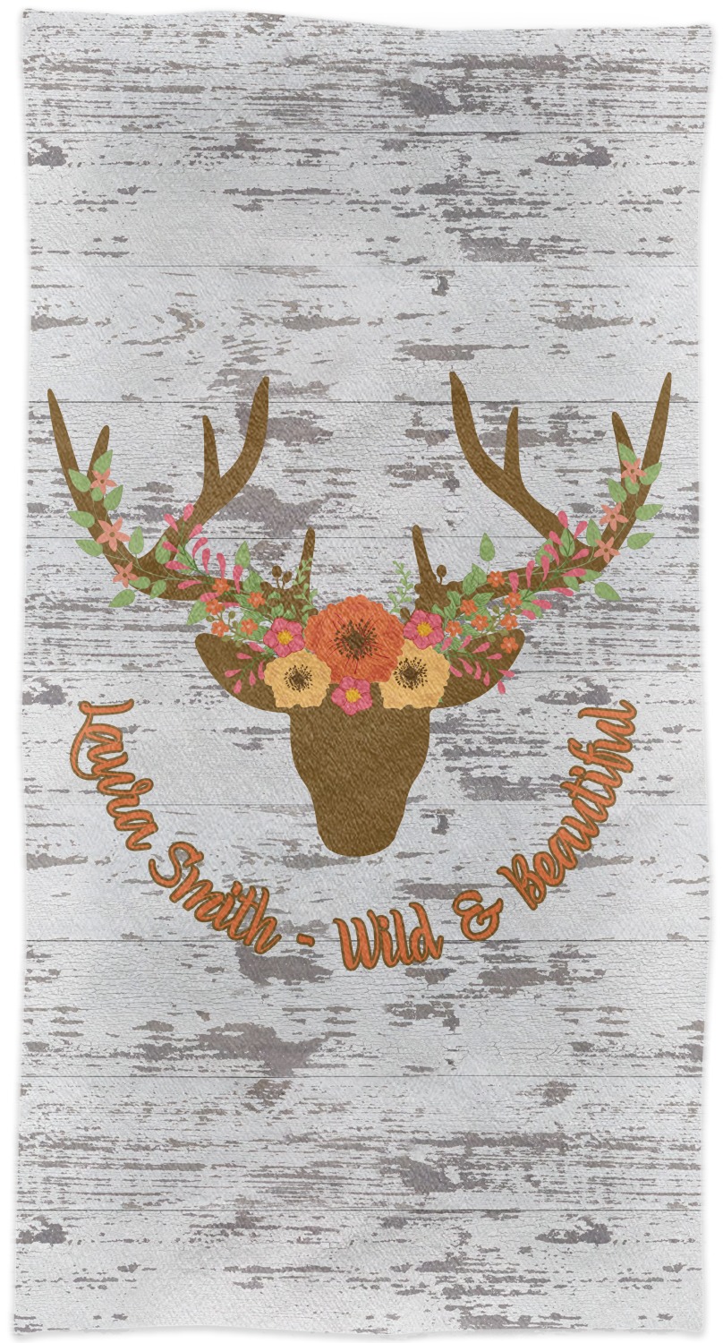This design has a fun distressed shiplap background that is tones of white and grey. On top of this is an adorable deer illustration with flowers surrounding its antlers. Underneath is a curving area for personalization. Add your name or a fun saying. You will find brown, pink, peach, yellow, and green in this fun design.