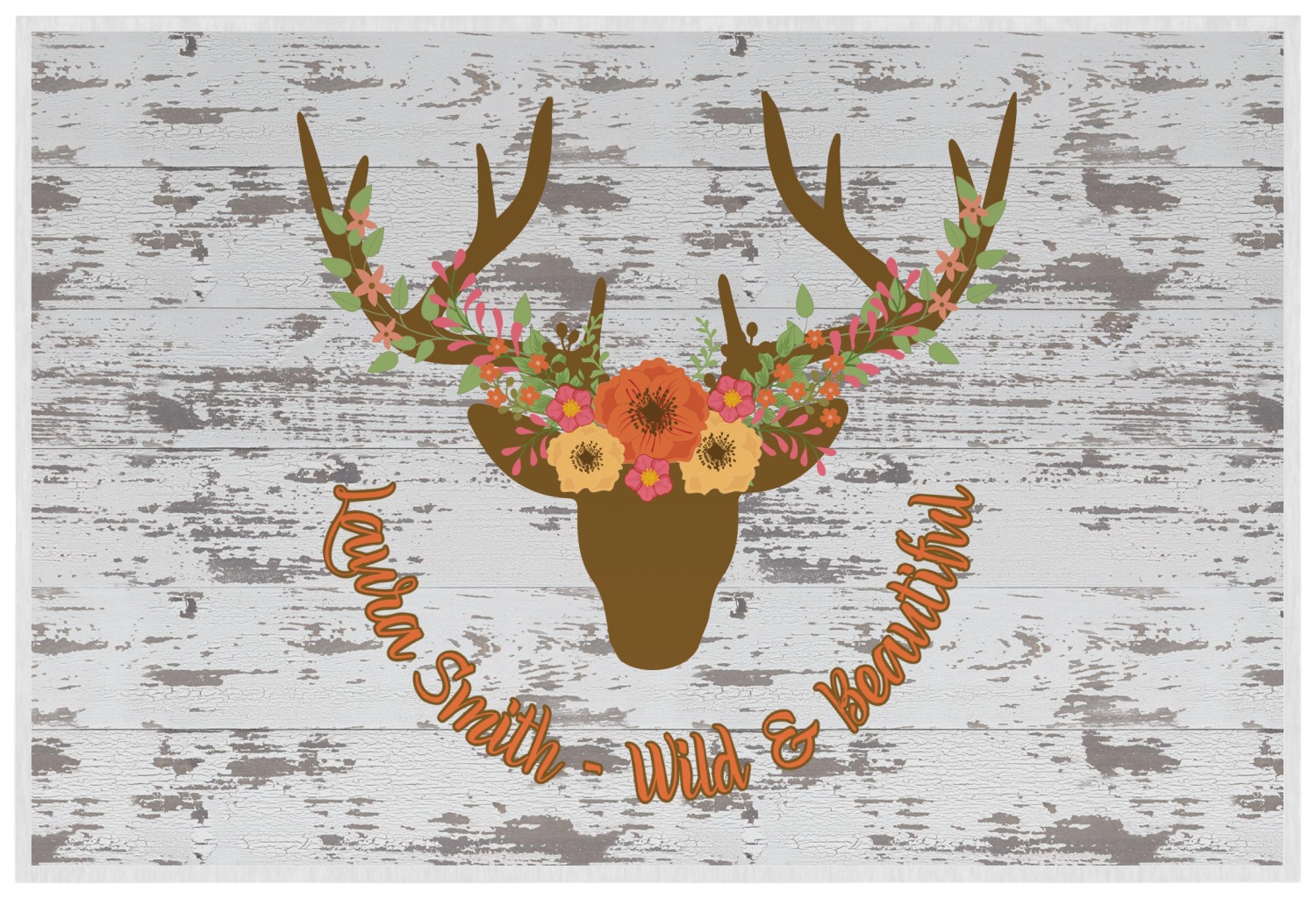 This design has a fun distressed shiplap background that is tones of white and grey. On top of this is an adorable deer illustration with flowers surrounding its antlers. Underneath is a curving area for personalization. Add your name or a fun saying. You will find brown, pink, peach, yellow, and green in this fun design.