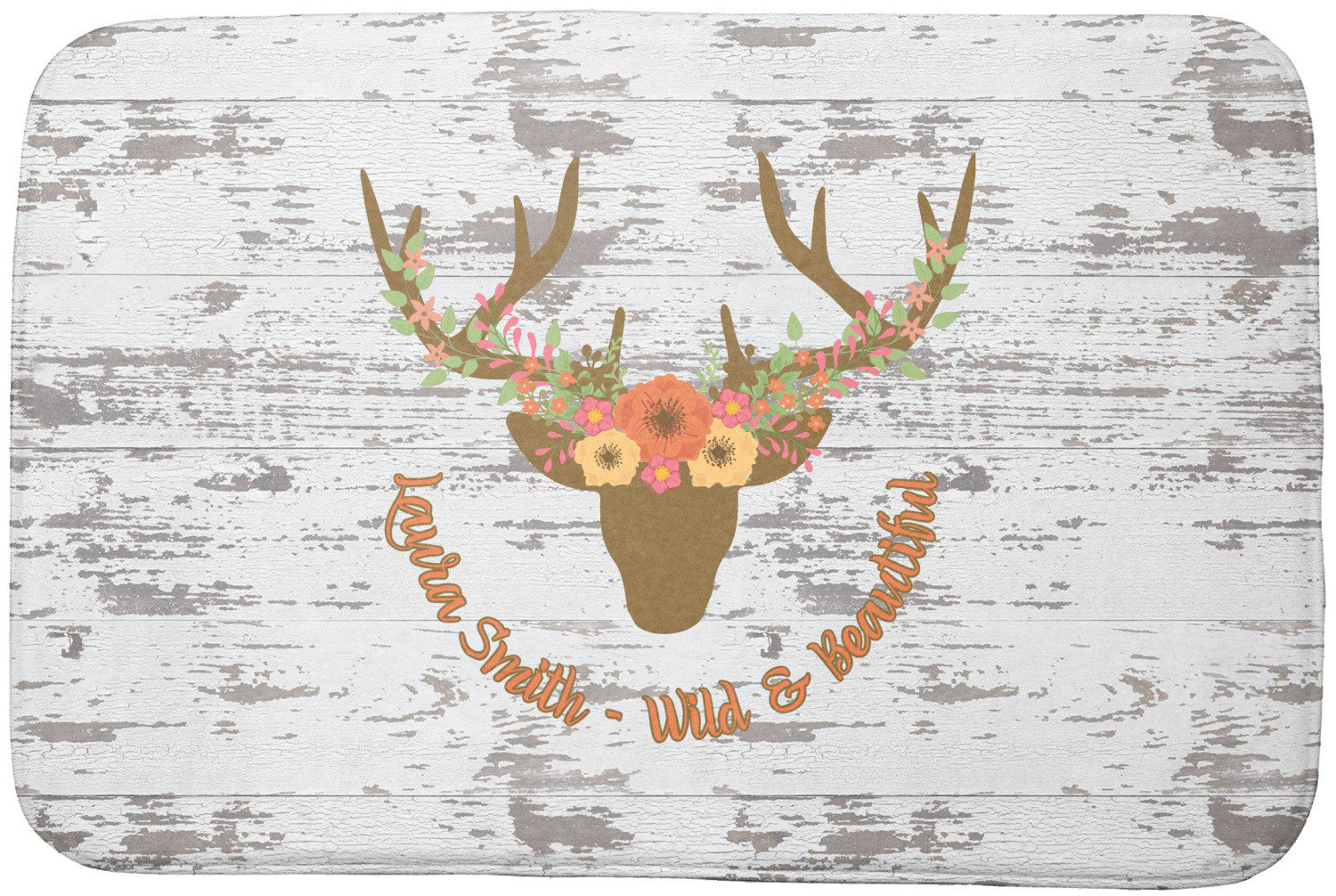 This design has a fun distressed shiplap background that is tones of white and grey. On top of this is an adorable deer illustration with flowers surrounding its antlers. Underneath is a curving area for personalization. Add your name or a fun saying. You will find brown, pink, peach, yellow, and green in this fun design.