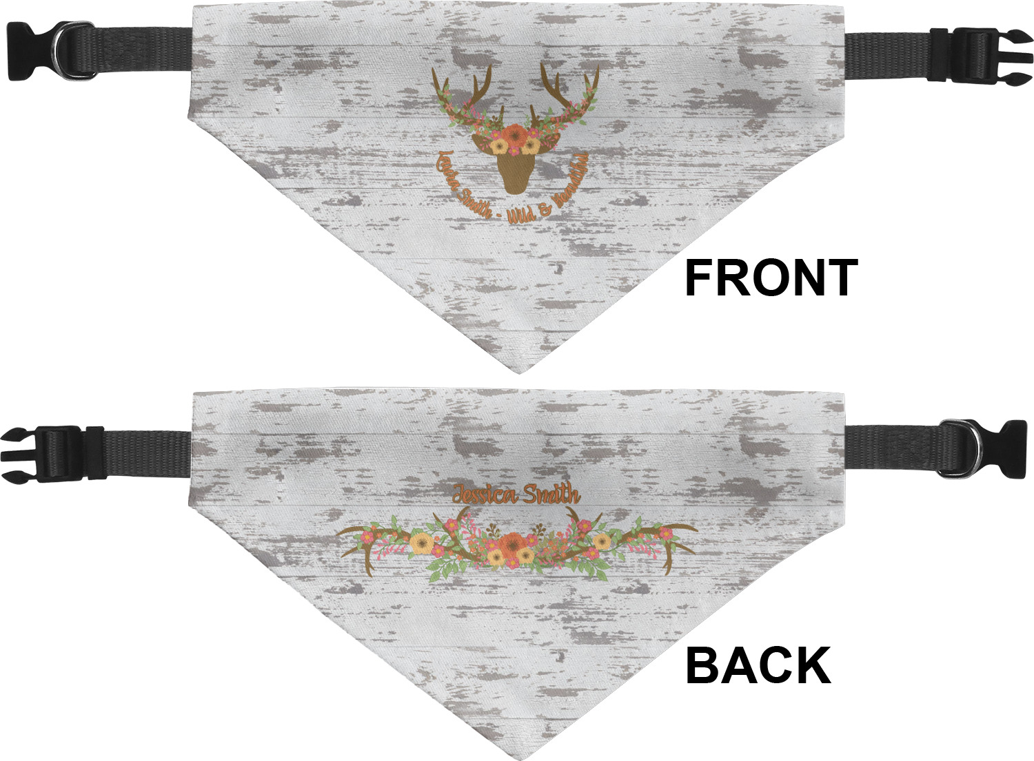 We print the front and back of these dog bandanas with your customized design. The bandana itself is made from a durable polyester, sewn together with a gap large enough to accommodate any collar. Regardless, the bandana includes a plain black, canvas collar with plastic snaps, that can easily be removed if desired. These dog bandana collars are available in four sizes: small, medium, large, and extra large. Please see our sizing chart for more information regarding the dimensions of each size.