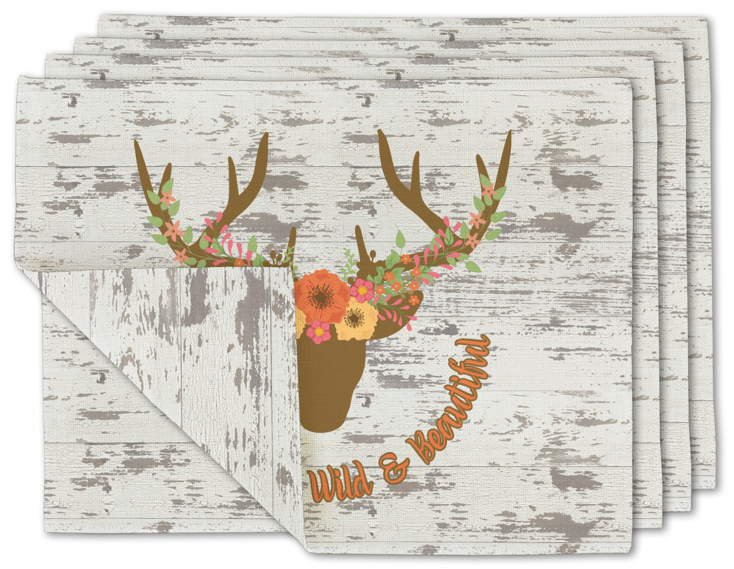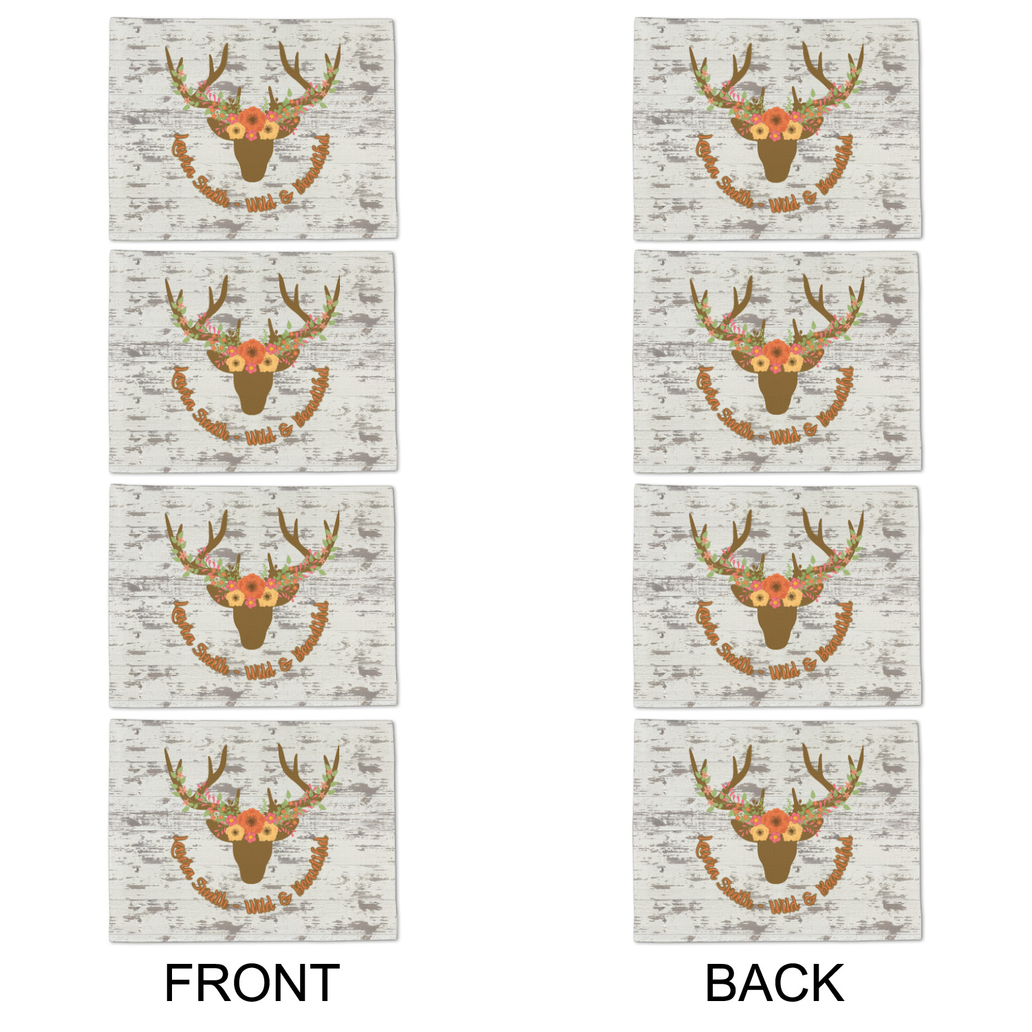 This design has a fun distressed shiplap background that is tones of white and grey. On top of this is an adorable deer illustration with flowers surrounding its antlers. Underneath is a curving area for personalization. Add your name or a fun saying. You will find brown, pink, peach, yellow, and green in this fun design.