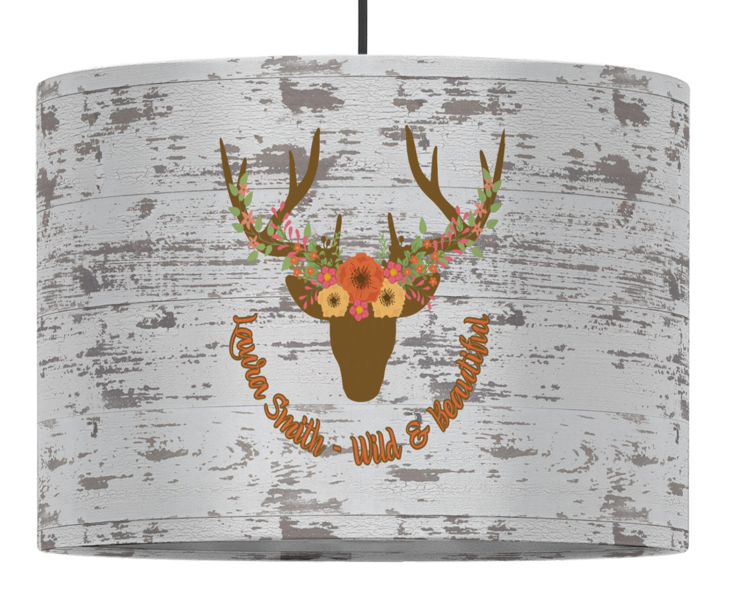 This design has a fun distressed shiplap background that is tones of white and grey. On top of this is an adorable deer illustration with flowers surrounding its antlers. Underneath is a curving area for personalization. Add your name or a fun saying. You will find brown, pink, peach, yellow, and green in this fun design.