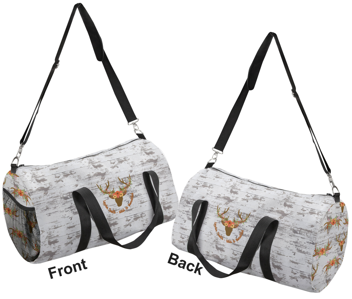 This duffle is a sturdy bag made of a canvas material. It comes in two sizes: Small (19"W x 9.5"H x 9.5"D) and Large (23"W x 12"H x 12"D). The bag is a cylindrical shape with a black adjustable strap and two handles. On one side is an elastic pouch to put a waterbottle or other small item. Your product will be sublimated with your design and is able to be designed on the front, back, and sides. Be sure to remember that the straps may cut into parts of your design if you upload your own artwork.