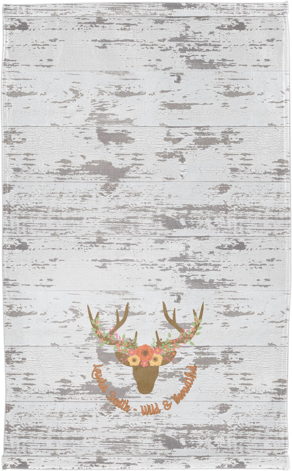 This design has a fun distressed shiplap background that is tones of white and grey. On top of this is an adorable deer illustration with flowers surrounding its antlers. Underneath is a curving area for personalization. Add your name or a fun saying. You will find brown, pink, peach, yellow, and green in this fun design.