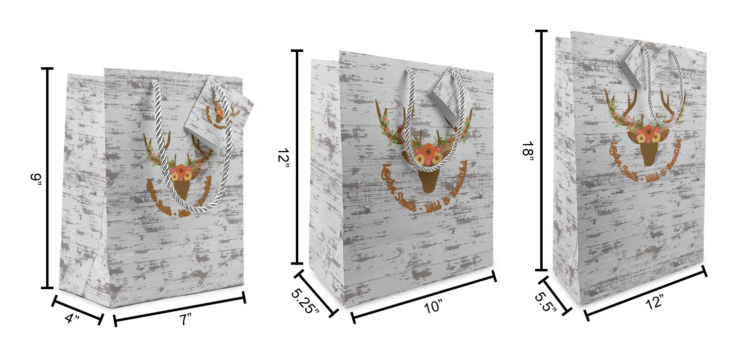 | Size (Varies By Option) | Small Gift Bag (7" x 4" x 9") Medium Gift Bag (10" x 5.25" x 12") Large Gift Bag (12" x 5.5" x 18") |