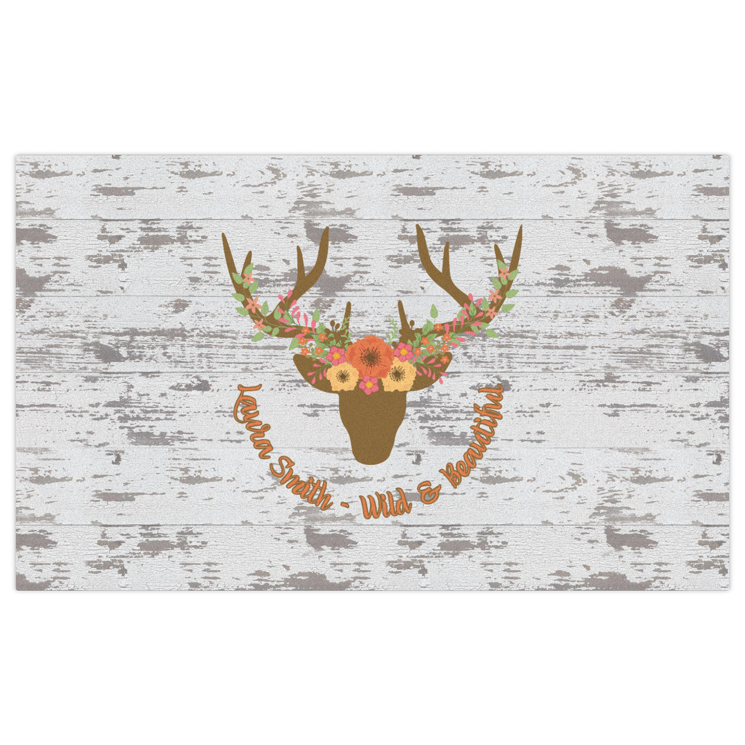 This design has a fun distressed shiplap background that is tones of white and grey. On top of this is an adorable deer illustration with flowers surrounding its antlers. Underneath is a curving area for personalization. Add your name or a fun saying. You will find brown, pink, peach, yellow, and green in this fun design.