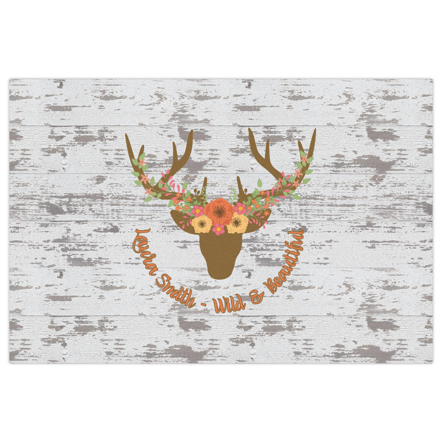 This design has a fun distressed shiplap background that is tones of white and grey. On top of this is an adorable deer illustration with flowers surrounding its antlers. Underneath is a curving area for personalization. Add your name or a fun saying. You will find brown, pink, peach, yellow, and green in this fun design.