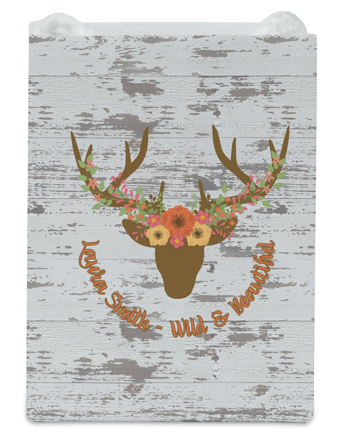 This design has a fun distressed shiplap background that is tones of white and grey. On top of this is an adorable deer illustration with flowers surrounding its antlers. Underneath is a curving area for personalization. Add your name or a fun saying. You will find brown, pink, peach, yellow, and green in this fun design.