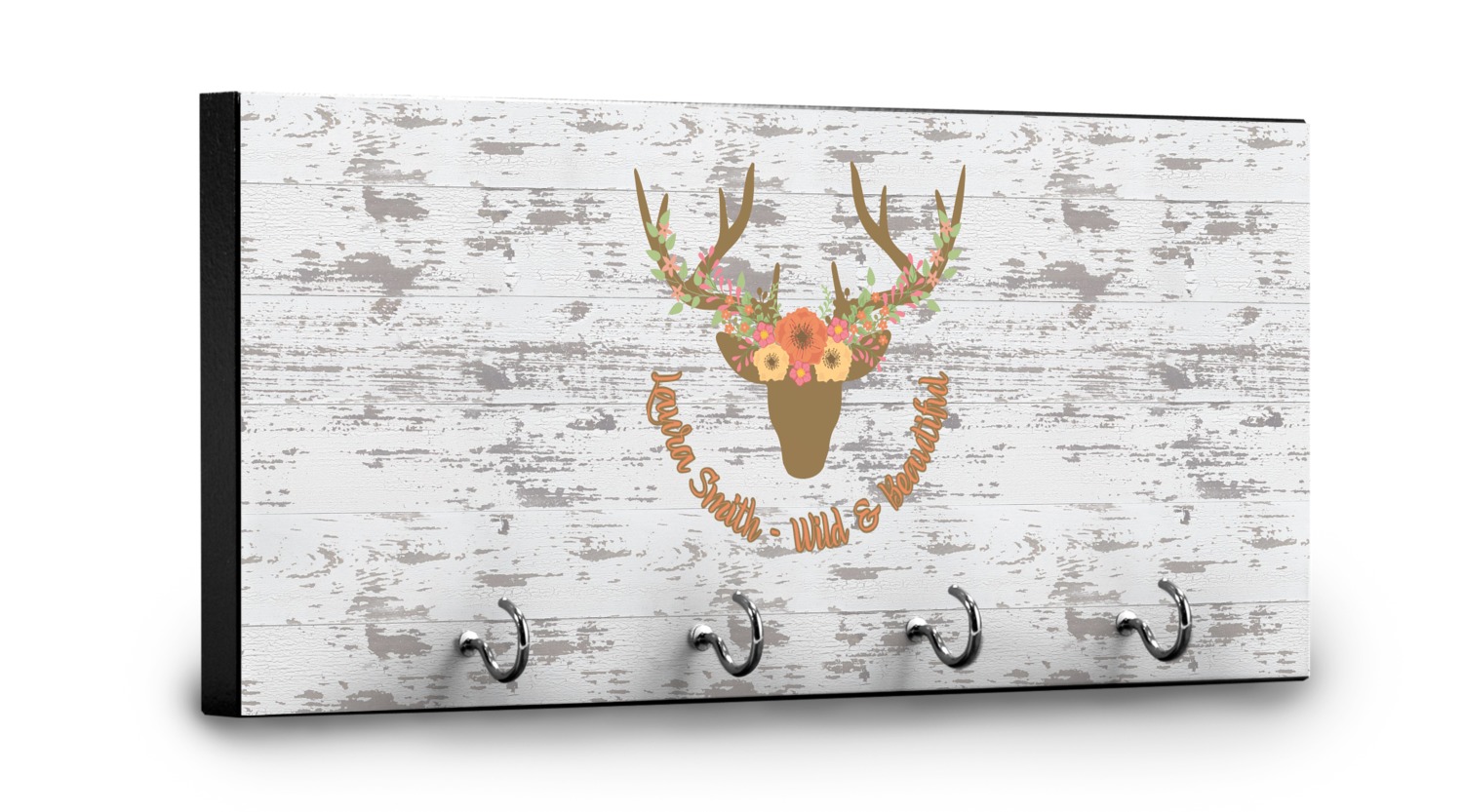 This design has a fun distressed shiplap background that is tones of white and grey. On top of this is an adorable deer illustration with flowers surrounding its antlers. Underneath is a curving area for personalization. Add your name or a fun saying. You will find brown, pink, peach, yellow, and green in this fun design.