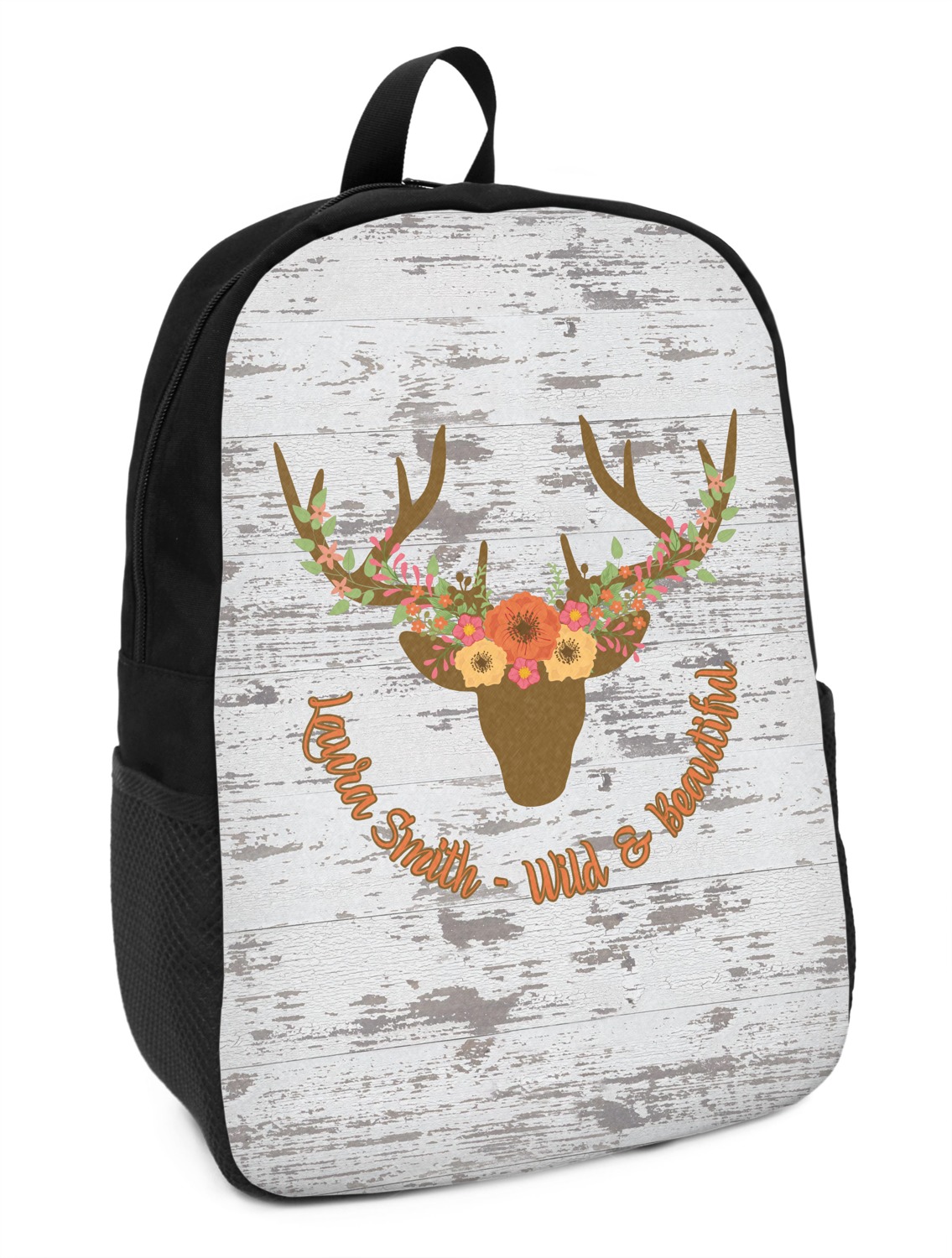 This design has a fun distressed shiplap background that is tones of white and grey. On top of this is an adorable deer illustration with flowers surrounding its antlers. Underneath is a curving area for personalization. Add your name or a fun saying. You will find brown, pink, peach, yellow, and green in this fun design.