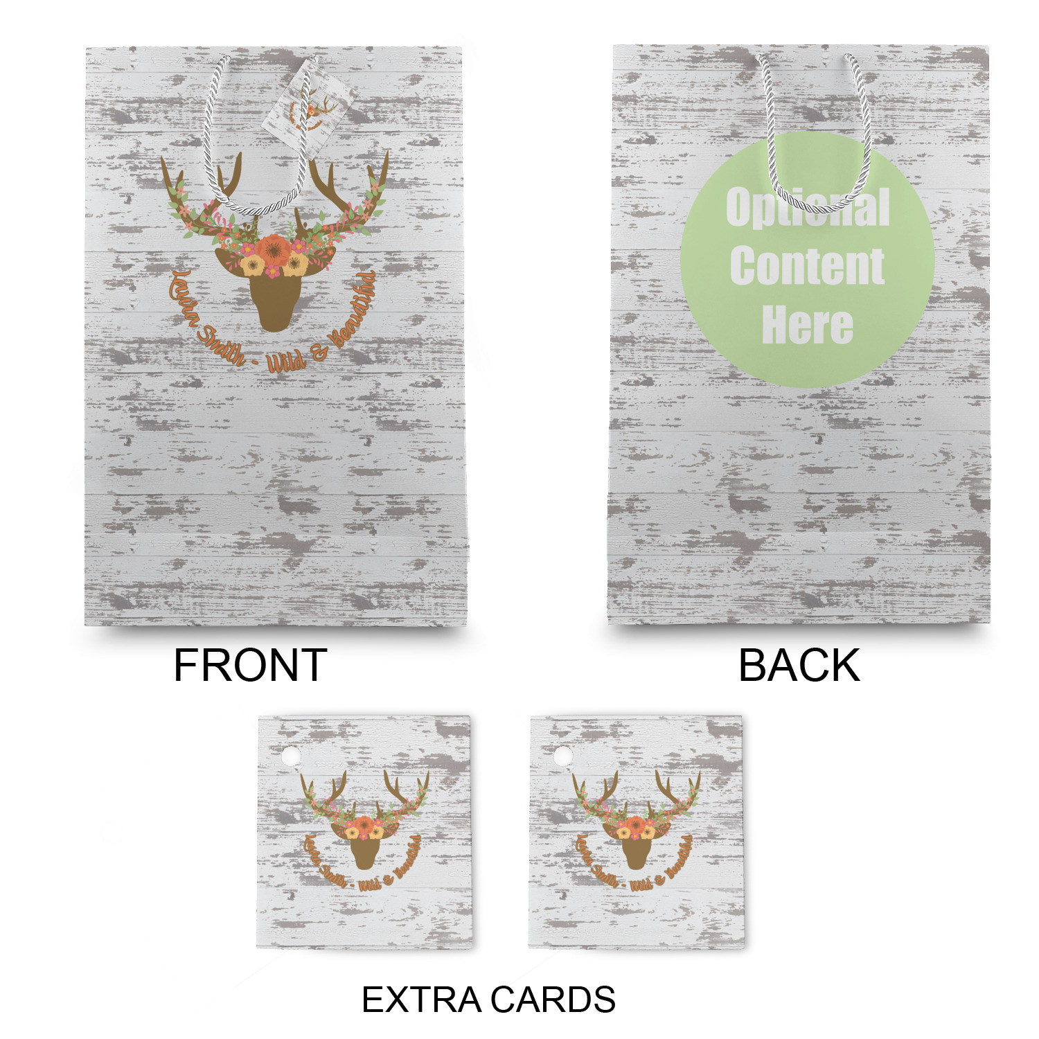 This design has a fun distressed shiplap background that is tones of white and grey. On top of this is an adorable deer illustration with flowers surrounding its antlers. Underneath is a curving area for personalization. Add your name or a fun saying. You will find brown, pink, peach, yellow, and green in this fun design.