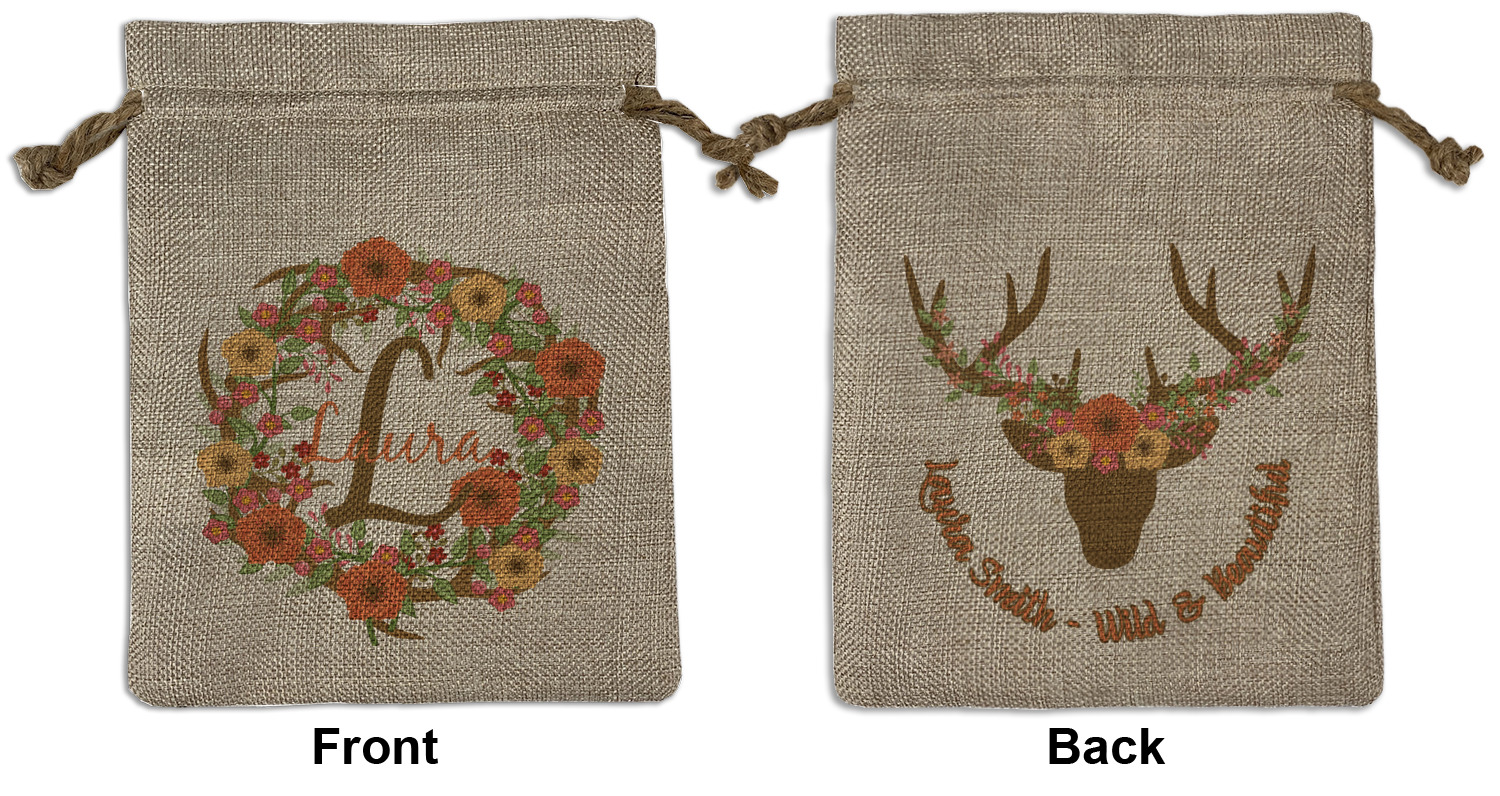 We sell our Burlap Gift Bags in 3 variant sized bags. Made with burlap polyester, each personalized bag can be secured with a twine drawstring pull. Your custom design is available to print on one side or both sides - completely up to you! The sizes of the bags measure approximately 4.5" x 6.5" for the smallest size, 6.5" x 8.0" for the medium size, and 6.5" x 13.5" for the large-sized bag.