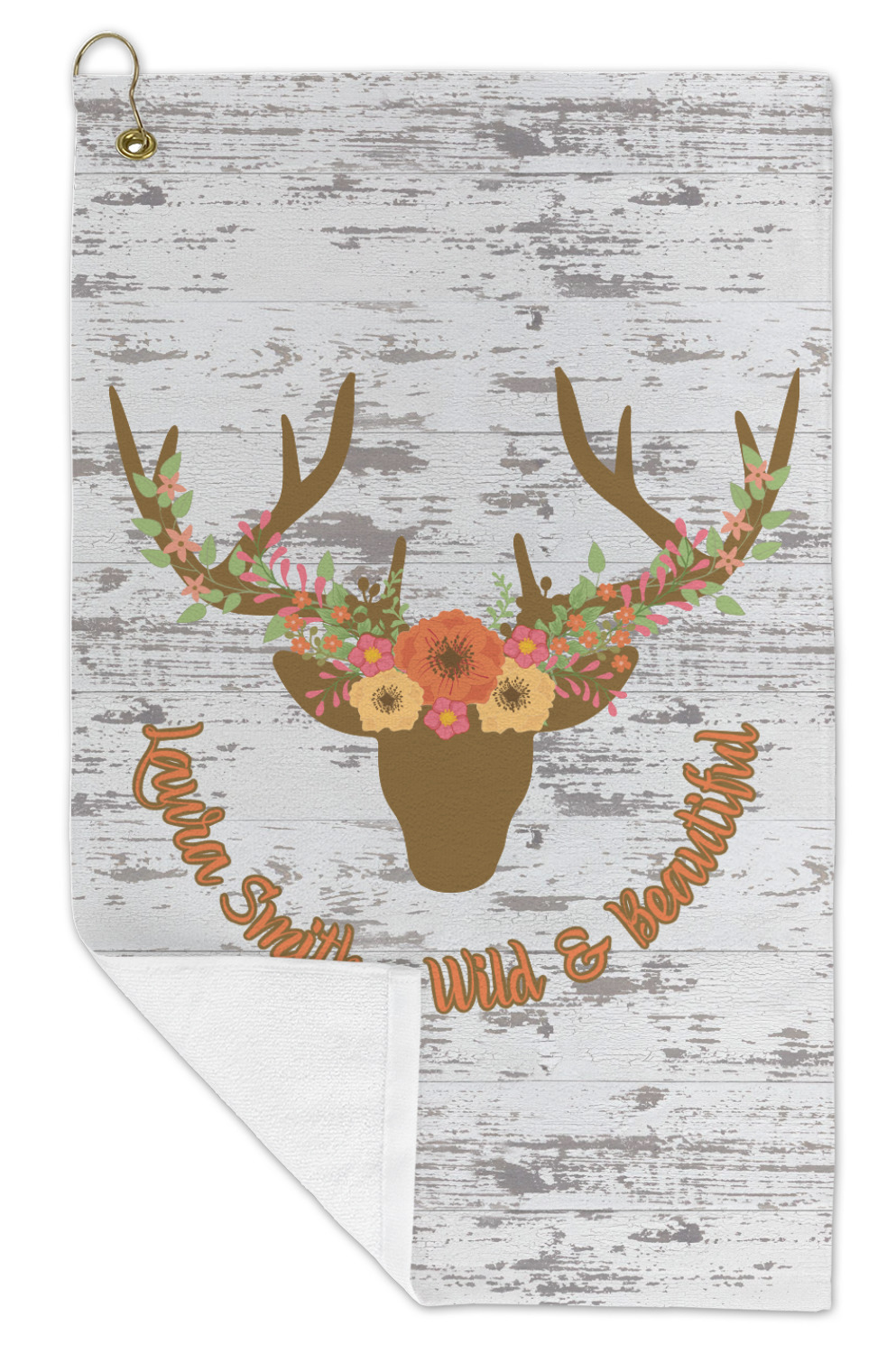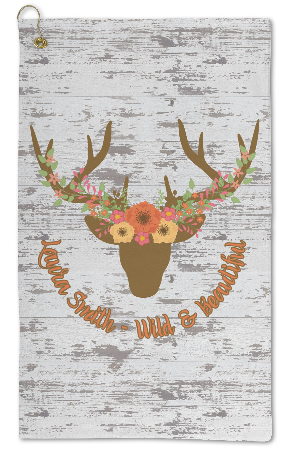 This design has a fun distressed shiplap background that is tones of white and grey. On top of this is an adorable deer illustration with flowers surrounding its antlers. Underneath is a curving area for personalization. Add your name or a fun saying. You will find brown, pink, peach, yellow, and green in this fun design.