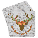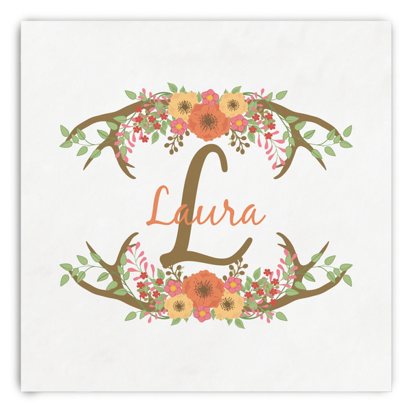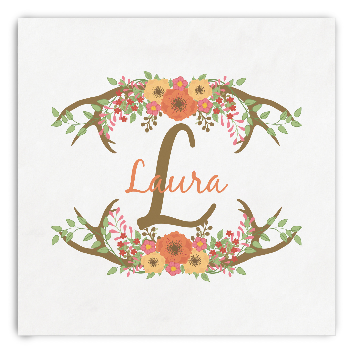 This design has a fun distressed shiplap background that is tones of white and grey. On top of this is an adorable deer illustration with flowers surrounding its antlers. Underneath is a curving area for personalization. Add your name or a fun saying. You will find brown, pink, peach, yellow, and green in this fun design.