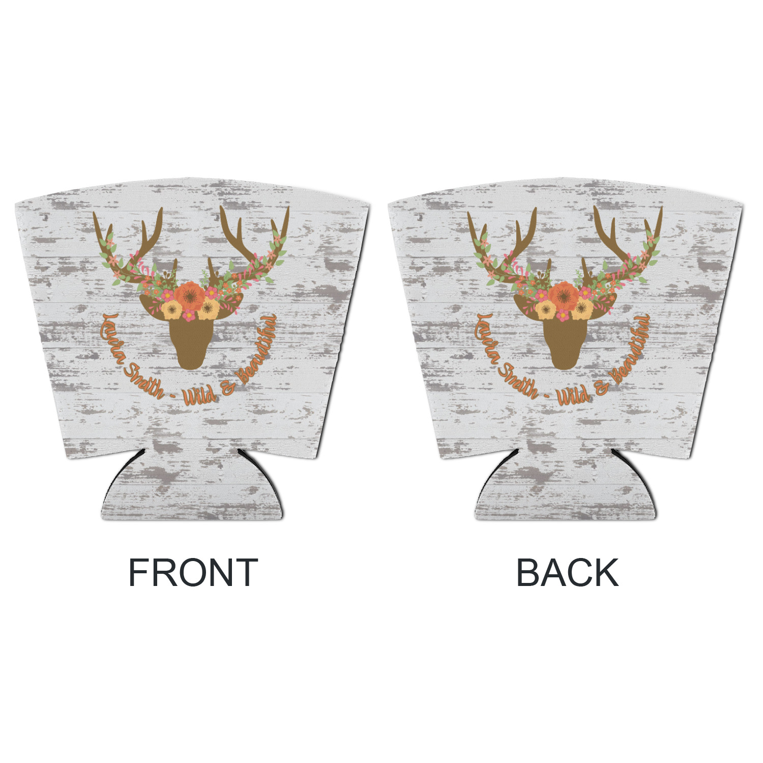 This design has a fun distressed shiplap background that is tones of white and grey. On top of this is an adorable deer illustration with flowers surrounding its antlers. Underneath is a curving area for personalization. Add your name or a fun saying. You will find brown, pink, peach, yellow, and green in this fun design.