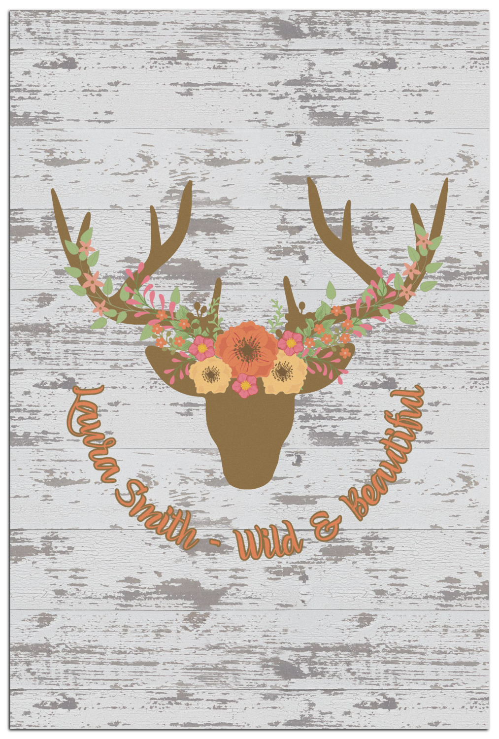 This design has a fun distressed shiplap background that is tones of white and grey. On top of this is an adorable deer illustration with flowers surrounding its antlers. Underneath is a curving area for personalization. Add your name or a fun saying. You will find brown, pink, peach, yellow, and green in this fun design.