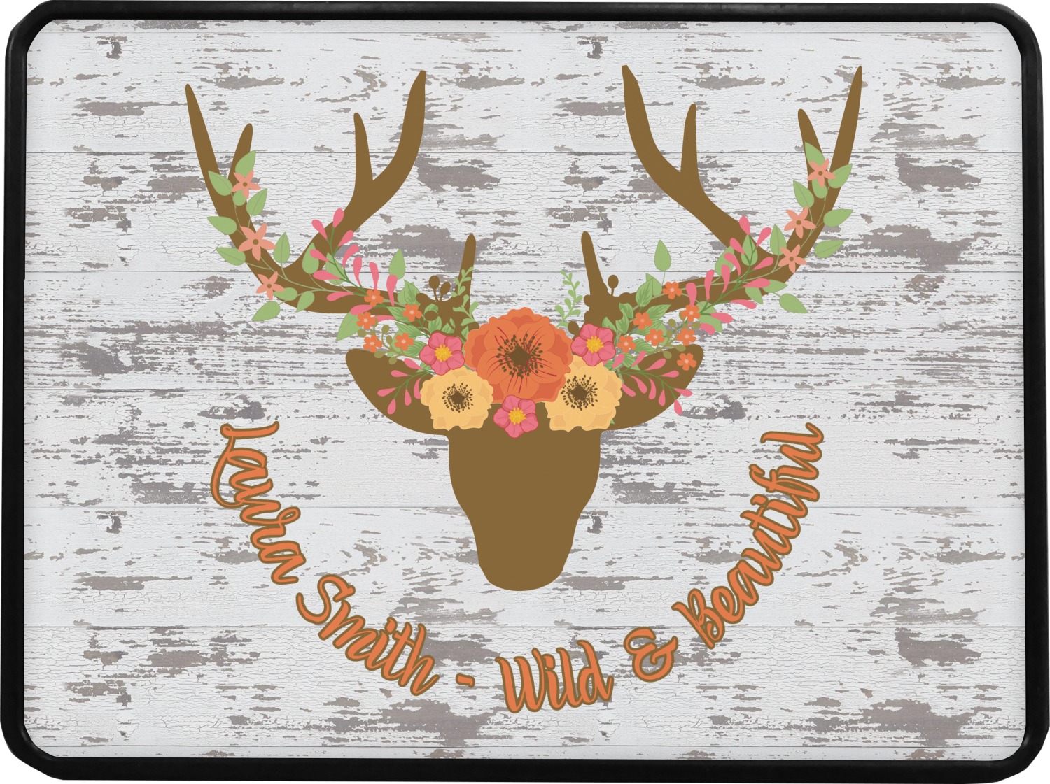 This design has a fun distressed shiplap background that is tones of white and grey. On top of this is an adorable deer illustration with flowers surrounding its antlers. Underneath is a curving area for personalization. Add your name or a fun saying. You will find brown, pink, peach, yellow, and green in this fun design.
