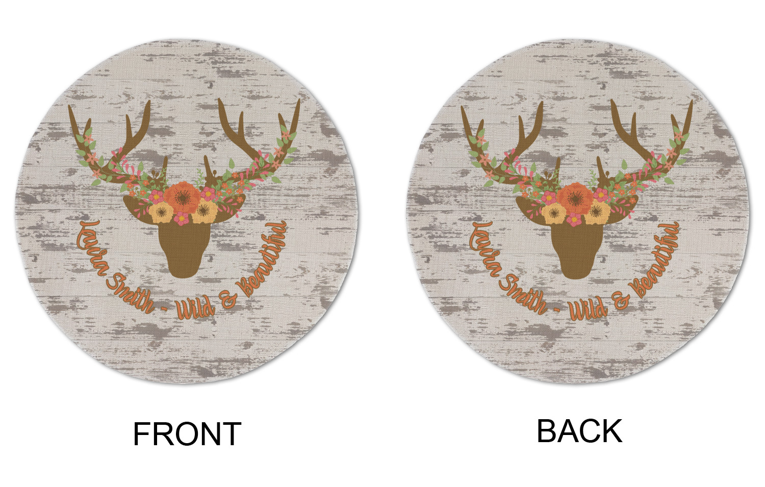 This design has a fun distressed shiplap background that is tones of white and grey. On top of this is an adorable deer illustration with flowers surrounding its antlers. Underneath is a curving area for personalization. Add your name or a fun saying. You will find brown, pink, peach, yellow, and green in this fun design.
