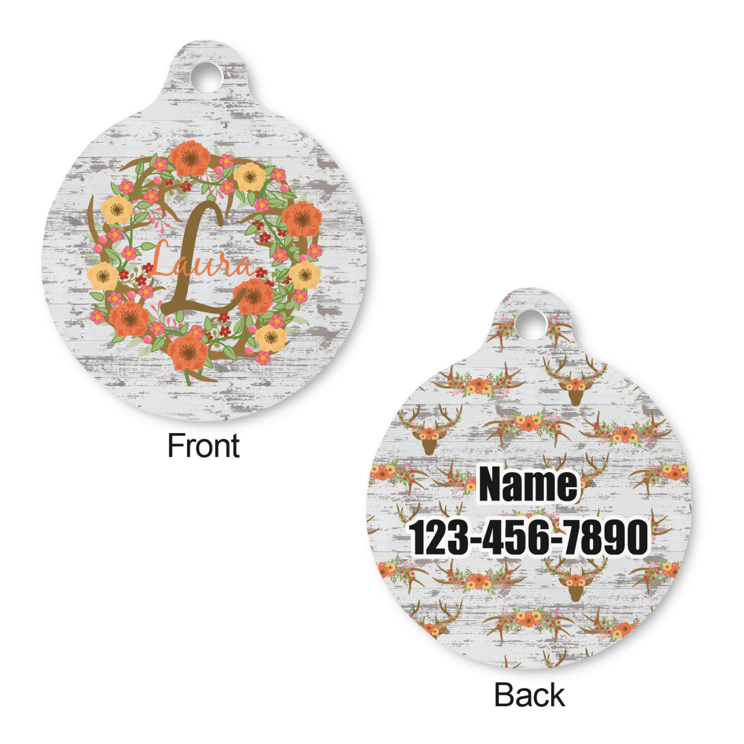 This design has a fun distressed shiplap background that is tones of white and grey. On top of this is an adorable deer illustration with flowers surrounding its antlers. Underneath is a curving area for personalization. Add your name or a fun saying. You will find brown, pink, peach, yellow, and green in this fun design.
