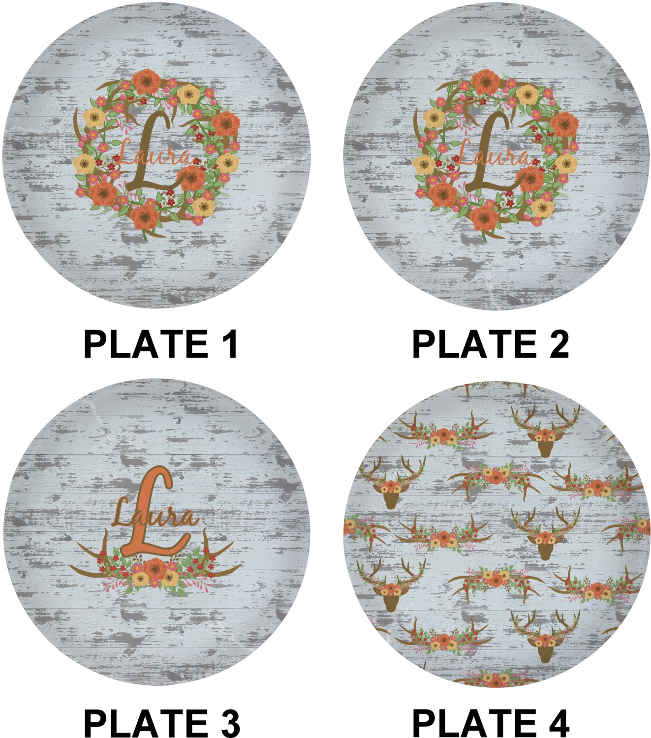 This design has a fun distressed shiplap background that is tones of white and grey. On top of this is an adorable deer illustration with flowers surrounding its antlers. Underneath is a curving area for personalization. Add your name or a fun saying. You will find brown, pink, peach, yellow, and green in this fun design.