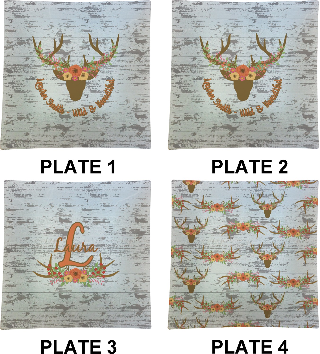 This design has a fun distressed shiplap background that is tones of white and grey. On top of this is an adorable deer illustration with flowers surrounding its antlers. Underneath is a curving area for personalization. Add your name or a fun saying. You will find brown, pink, peach, yellow, and green in this fun design.