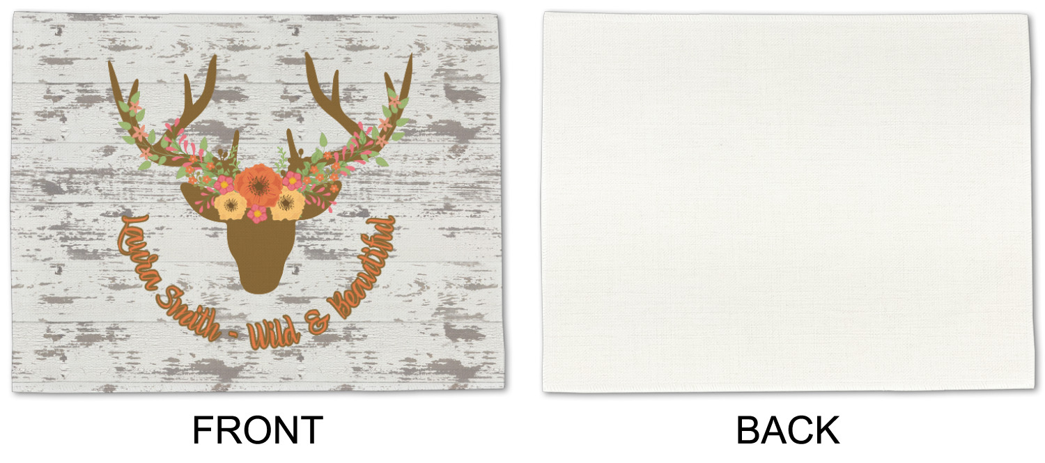 This design has a fun distressed shiplap background that is tones of white and grey. On top of this is an adorable deer illustration with flowers surrounding its antlers. Underneath is a curving area for personalization. Add your name or a fun saying. You will find brown, pink, peach, yellow, and green in this fun design.